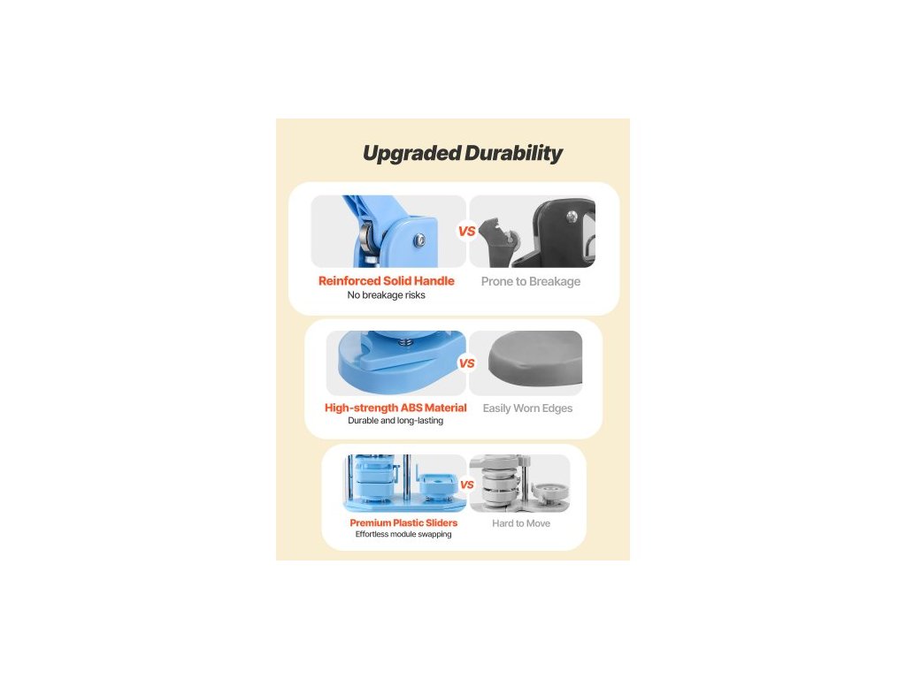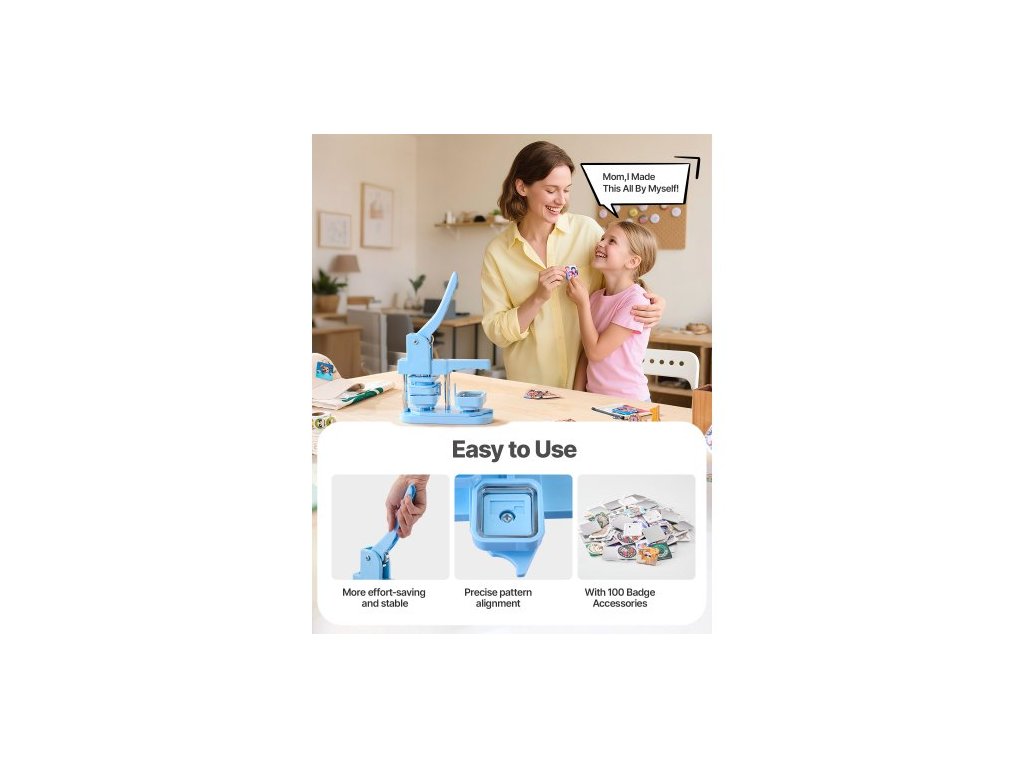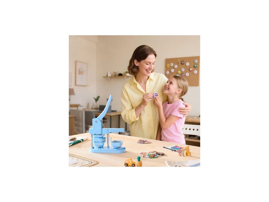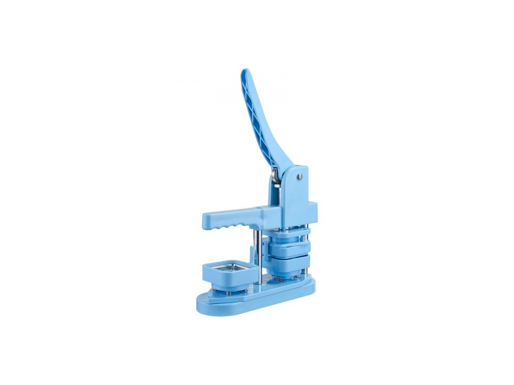 Stroj na výrobu knoflíků , čtverec 50 x 50 mm, plastový výrobník odznaků s předním plechovým krytem, plastovými zadními kryty, magnetickými podložkami a průhlednými fóliemi, ergonomická rukojeť, pro výrobu odznaků, modráErgonomická rukojeť
