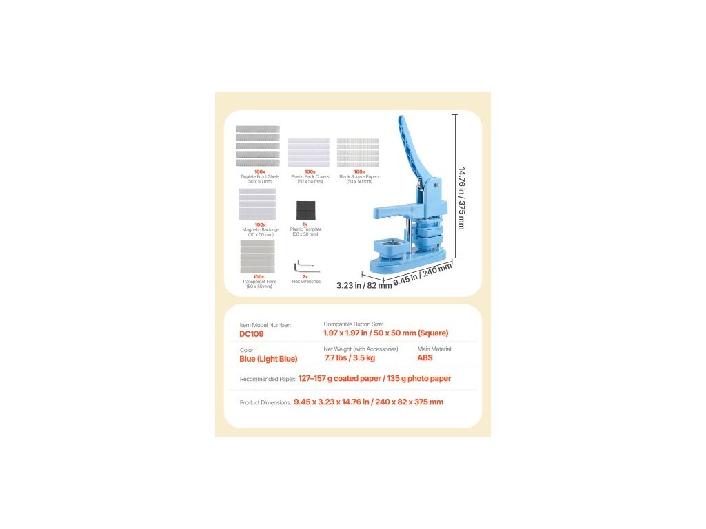 Kompatibilní velikost knoflíků: 1,97 x 1,97 palce / 50 x 50 mm (čtverec),Doporučený papír: 127–157 g potahovaný papír / 135 g fotografický papír,Barva: Modrá (světle modrá),Číslo modelu položky: DC109,Čistá hmotnost (s příslušenstvím): 7,7 lbs / 3,5 kg,Rozměry výrobku: 9,45 x 3,23 x 14,76 palce / 240 x 82 x 375 mm, hlavní materiál: ABS