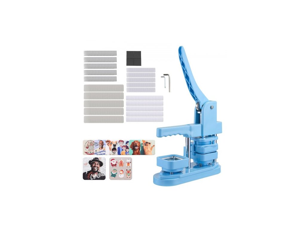 Stroj na výrobu knoflíků , čtverec 50 x 50 mm, plastový výrobník odznaků s plechovým předním krytem, plastovými zadními kryty, magnetickými podložkami a průhlednými fóliemi, ergonomická rukojeť, pro výrobu odznaků, modrý