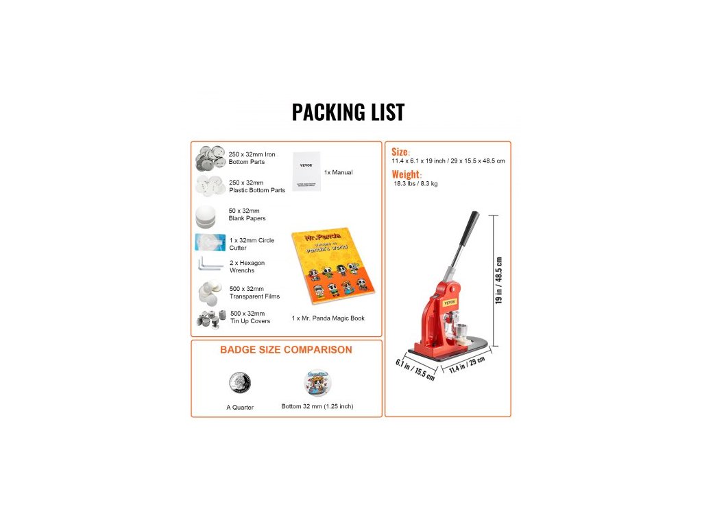 Ovládání: Ruční, Průměr raznice: 1,25 palce / 32 mm, Rozměry: 11,4 x 6,1 x 19 palců / 29 x 15,5 x 48,5 cm, Model: BJS-32-RD-01, Materiál: Železo a ABS, Hmotnost: 18,3 lbs / 8,3 kg