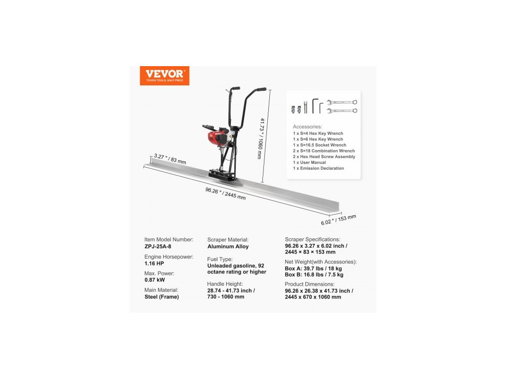 Čistá hmotnost (s příslušenstvím): Krabice A: 18 kg; Krabice B: 7,5 kg,Specifikace škrabky: 2445 x 83 x 153 mm,Nastavitelná výška rukojeti: 730–1060 mm,Model: ZPJ-25A-8,Materiál škrabky: Hliníková slitina,Max. Výkon: 0,87 kW, Výkon motoru: 1,16 HP, Rozměry produktu: 96,26 x 26,38 x 41,73 palce / 2445 x 670 x 1060 mm, Hlavní materiál: Ocel, Typ paliva: Bezolovnatý benzín, oktanové číslo 92 nebo vyšší