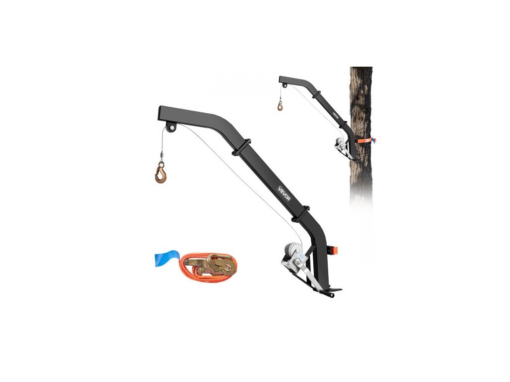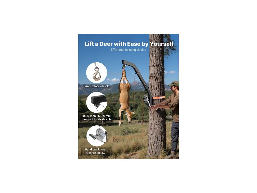 Zvedák na jelena montovaný na strom, nosnost 168 kg, zvedák na lov zvěře s ráčnovým popruhem, odolný závěs na jelena pro stahování kůže, čištění, zavěšování krmiva a ošetřování zvěře, černýZvedák na jelena montovaný na strom