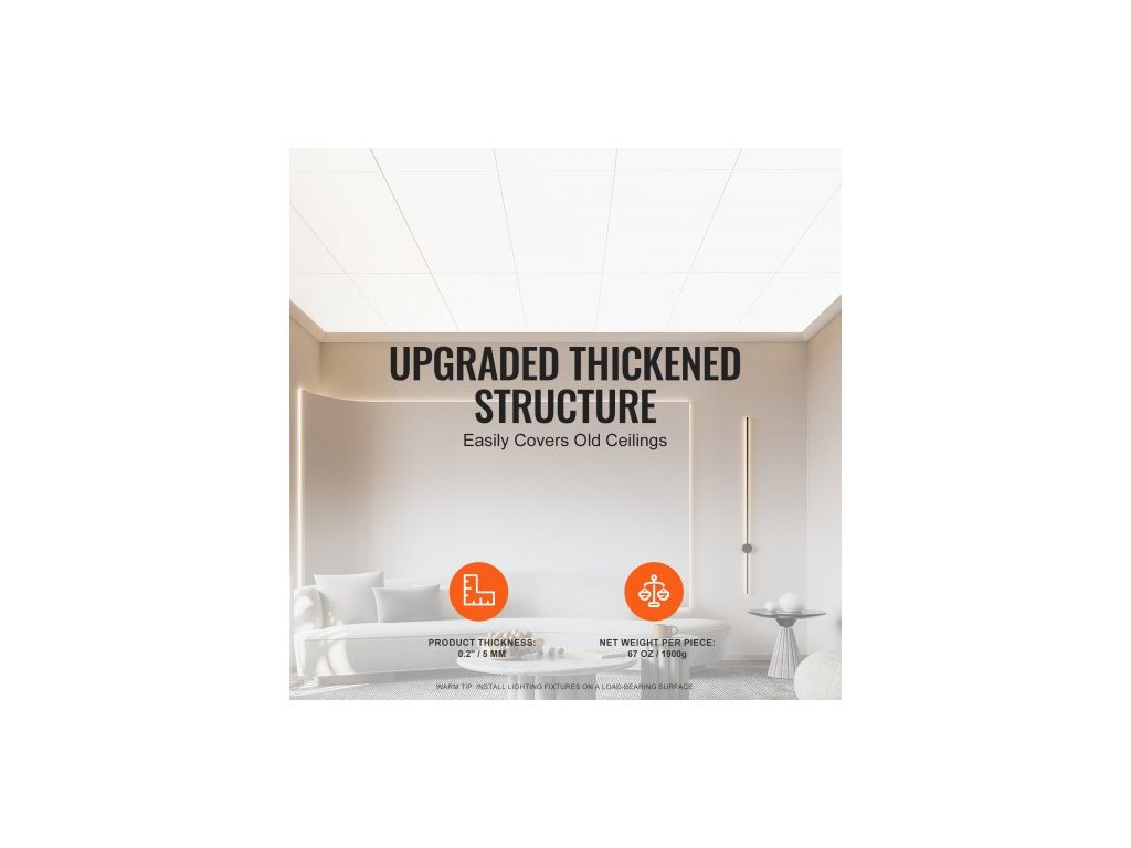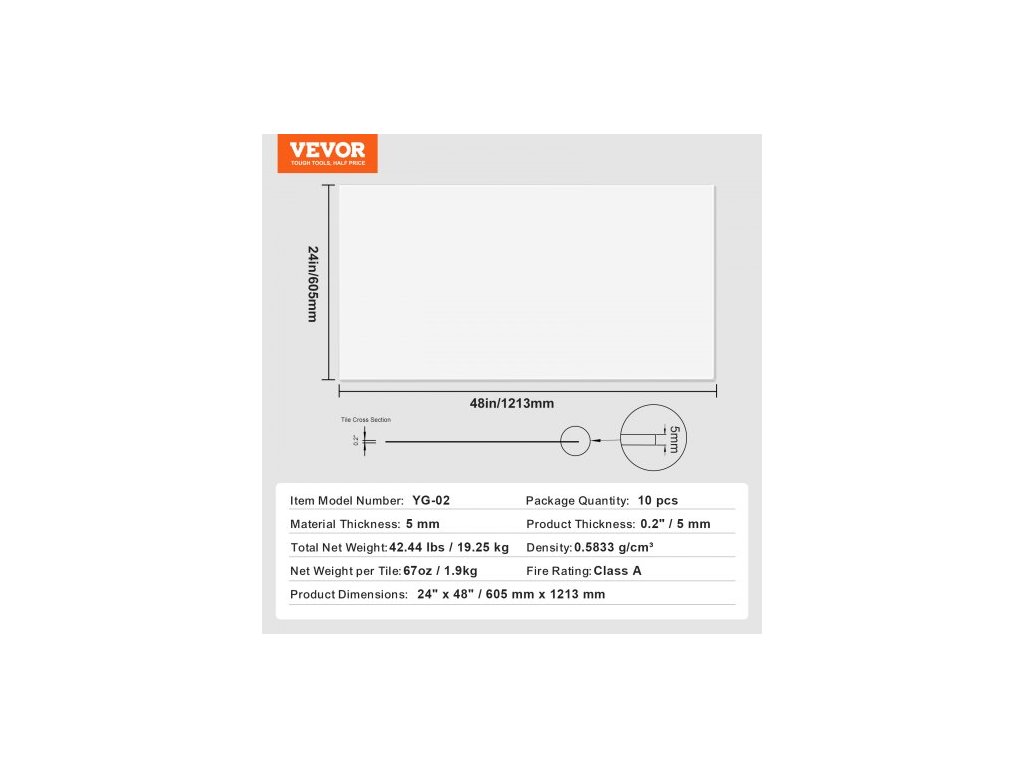 Celková čistá hmotnost: 19,25 kg,Barva: Bílá,Číslo modelu položky: YG-02,Čistá hmotnost na dlaždici: 67 oz / 1,9 kg,Množství v balení: 10 ks,Tloušťka výrobku: 0,2" / 5 mm,Rozměry výrobku: 24" x 48" / 605 mm x 1213 mm,Tloušťka materiálu: 5 mm,Hustota: 0,5833 g/cm³,Požární odolnost: Třída A,Hlavní materiál: PVC