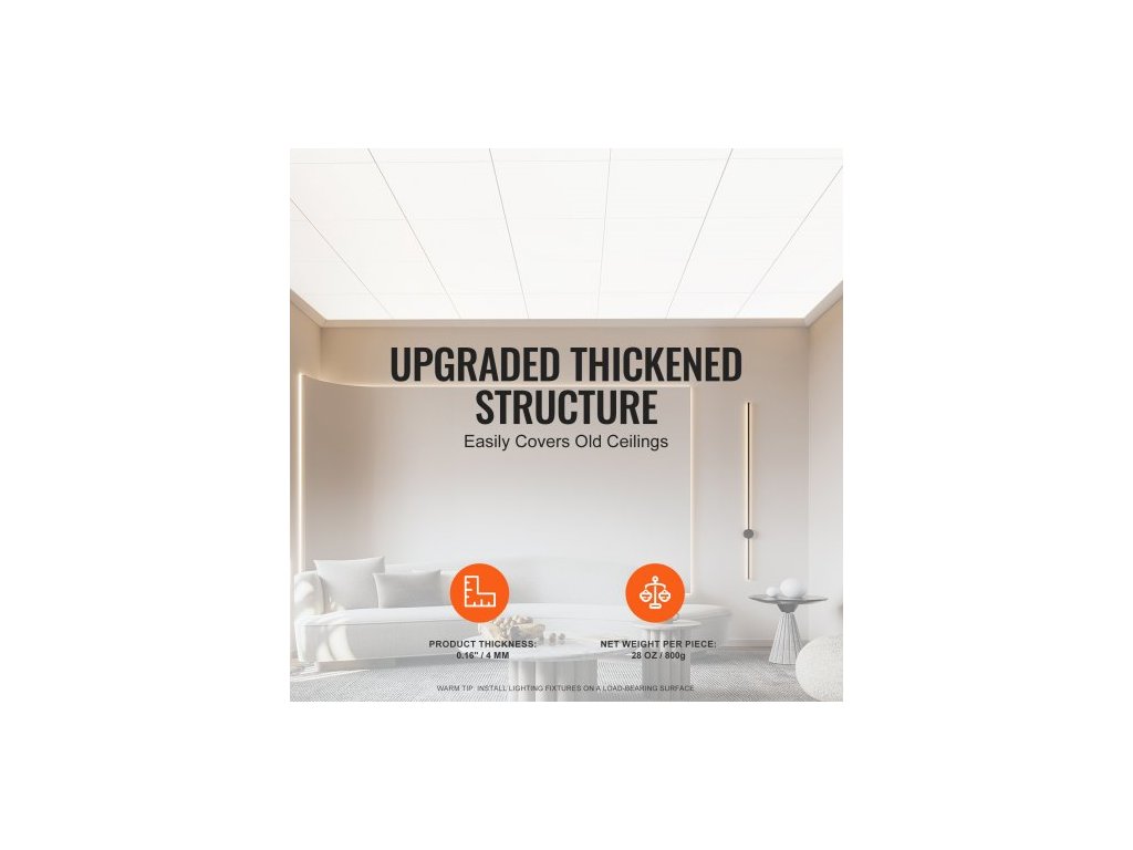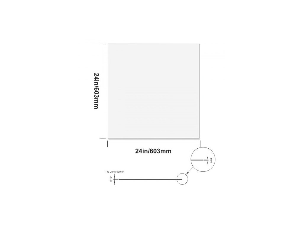 Celková čistá hmotnost: 9,4 kg,Barva: Bílá,Číslo modelu položky: YG-01,Čistá hmotnost na dlaždici: 28 oz / 0,8 kg,Množství v balení: 12 ks,Tloušťka výrobku: 0,16" / 4 mm,Rozměry výrobku: 24" x 24" / 603 mm x 603 mm,Tloušťka materiálu: 4 mm,Hustota: 0,5833 g/cm³,Požární odolnost: Třída A,Hlavní materiál: PVC
