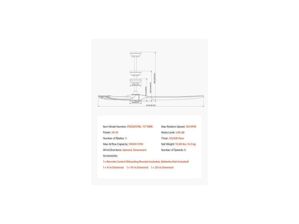 Rozměry produktu (10palcová spouštěcí tyč): Φ70,87 x 16,09"/Φ1800 x 408,6 mm,Rozměry produktu (20palcová spouštěcí tyč): Φ70,87 x 26,09"/Φ1800 x 662,8 mm,Maximální průtok vzduchu: 10000 CFM,Rozměry produktu (6palcová spouštěcí tyč): Φ70,87 x 12,09"/Φ1800 x 307,2 mm, Počet rychlostí: 6, Směry větru: Nahoru, dolů, Hladina hluku: ≤50 dB, Časovač: 1/2/4/8 hodin, Maximální rychlost otáčení: 135 ot./min, Číslo modelu položky: FR25051NL-72"MBK, Počet lopatek: 3, Čistá hmotnost: 13,89 lbs / 6,3 kg, Příkon: 30 W