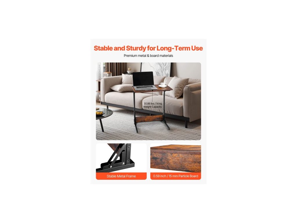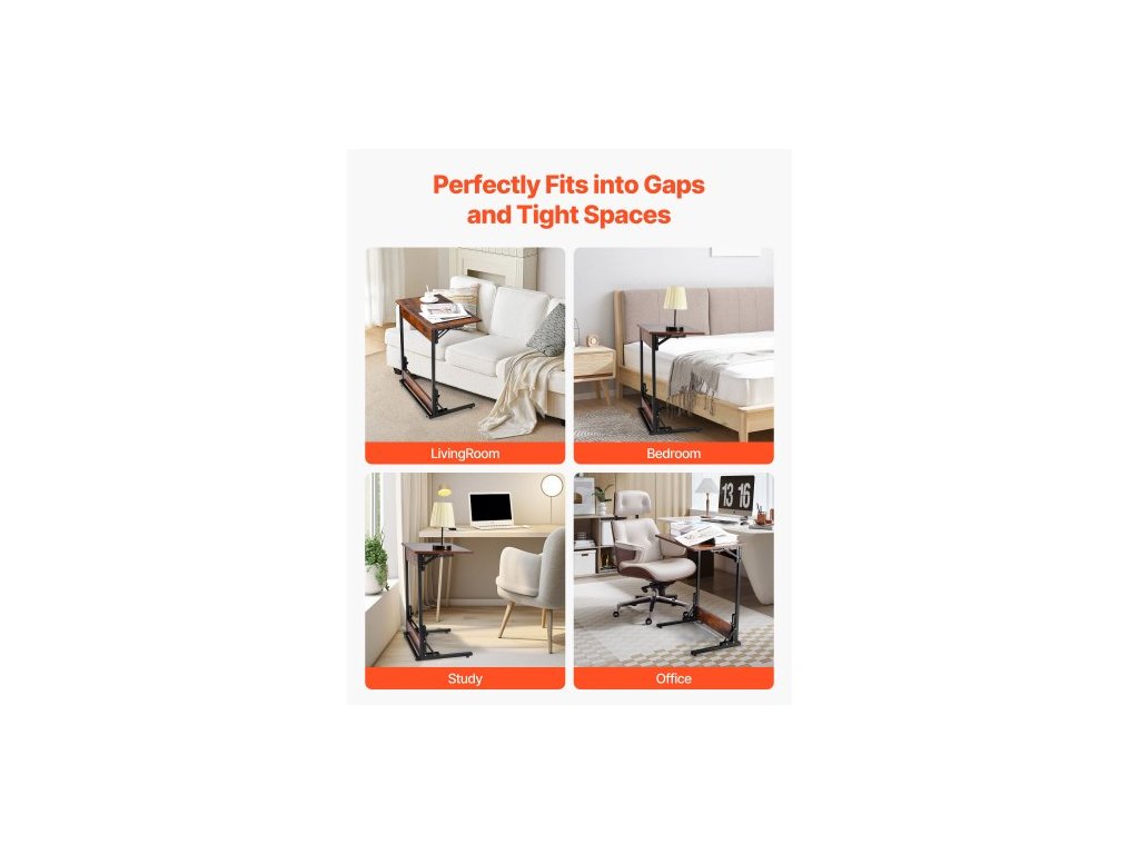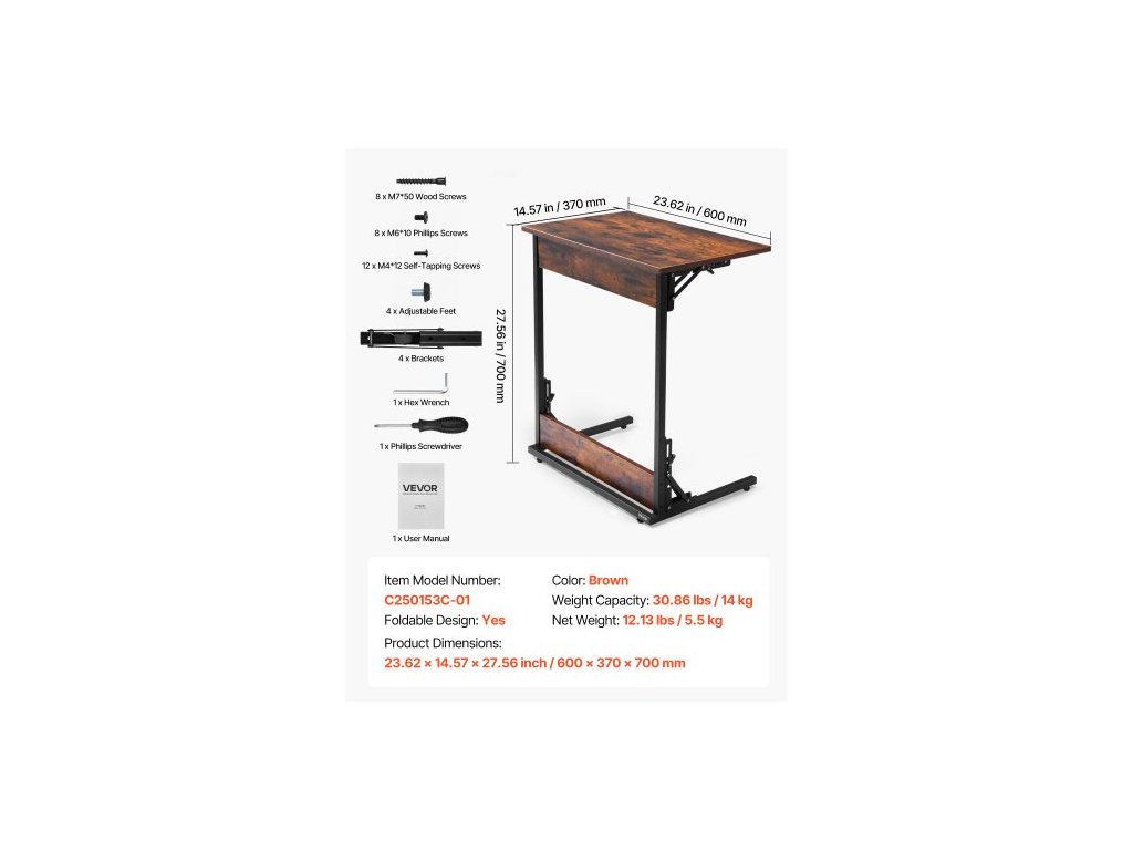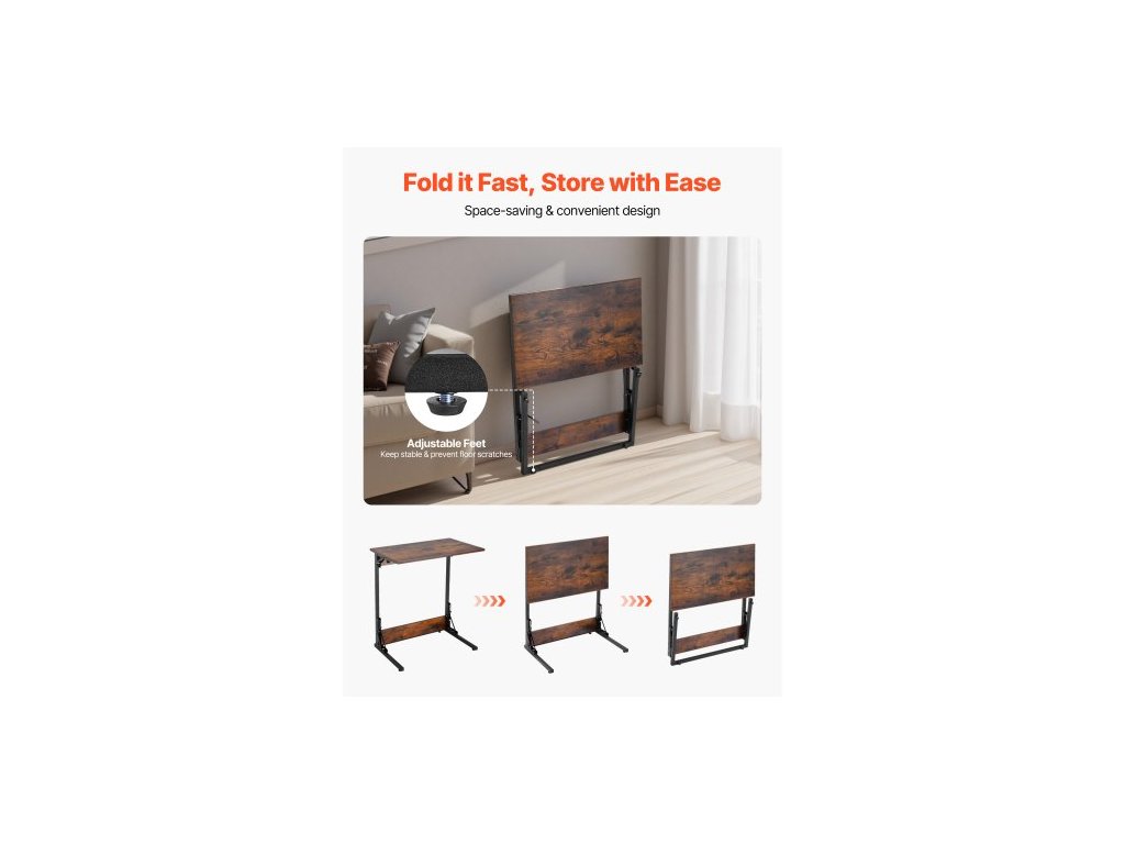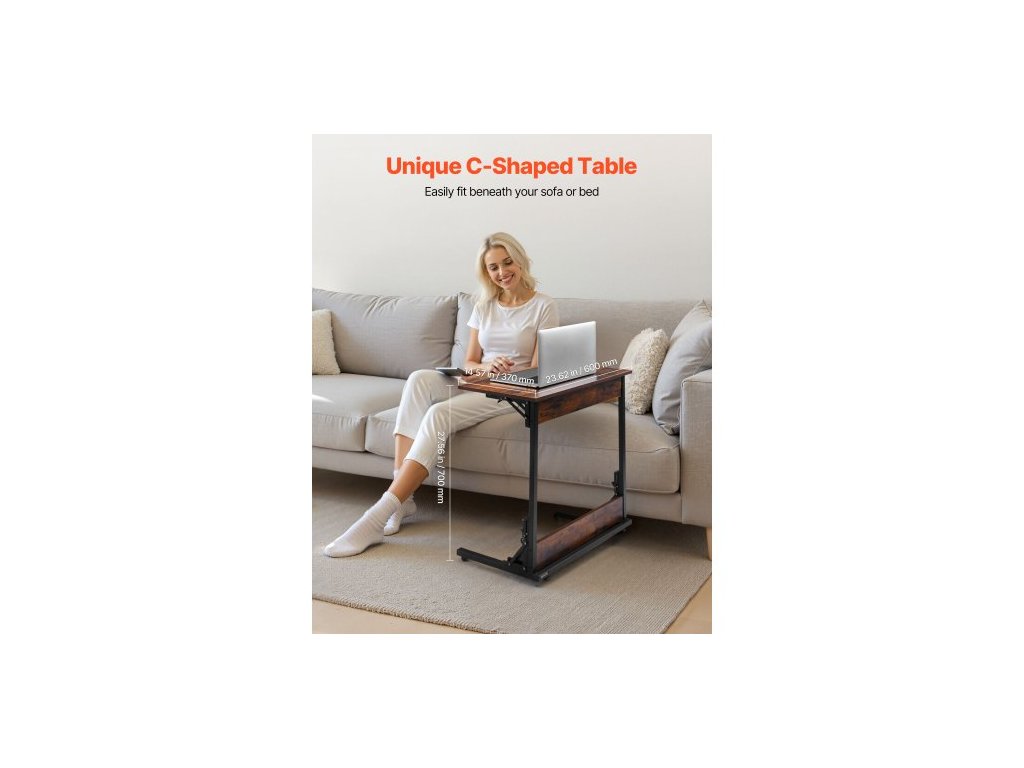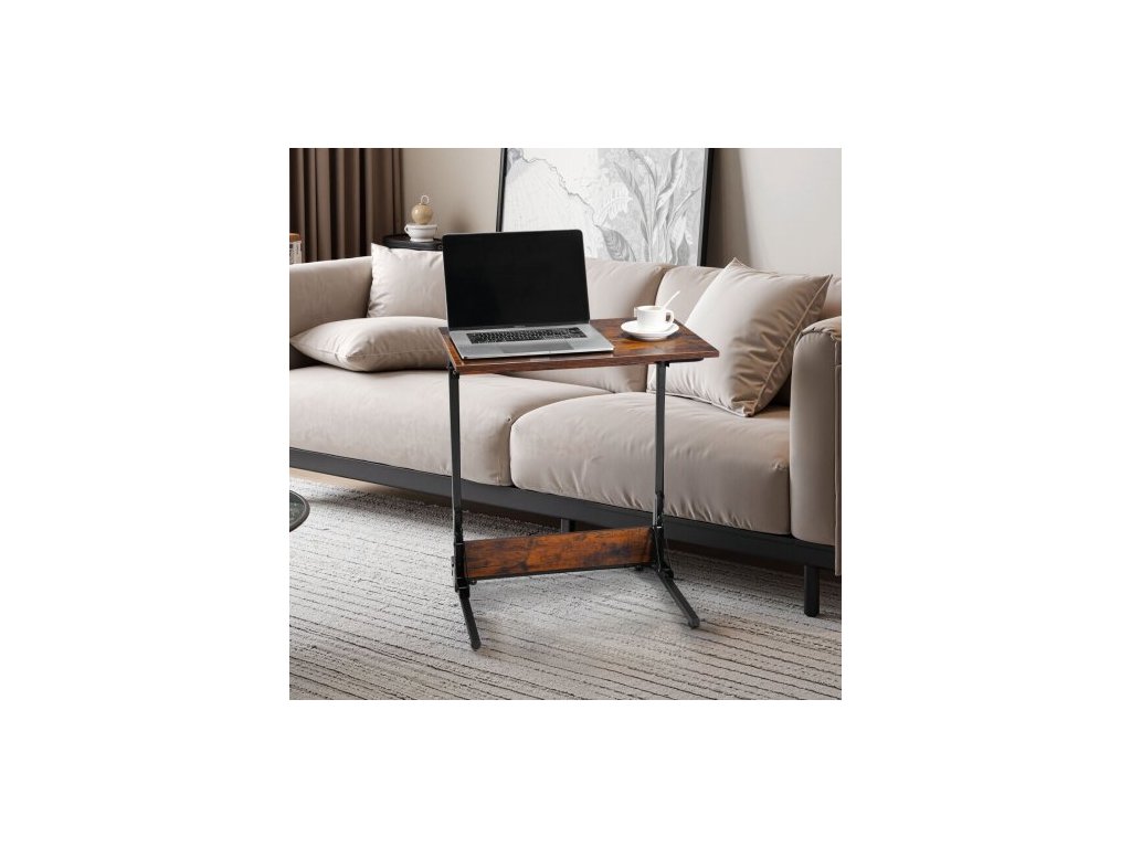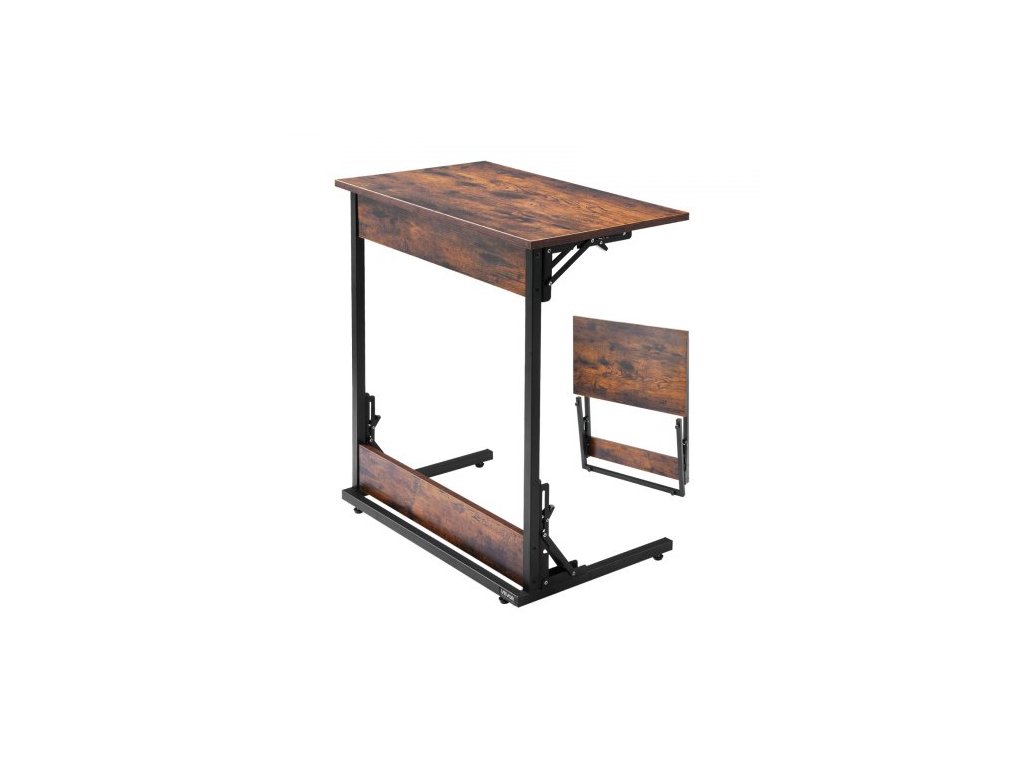 Stůl C, skládací koncový stolek ve tvaru C s kovovým rámem a nastavitelnými nohami, skládací odkládací stolek ve tvaru C do obývacího pokoje, ložnice, kanceláře, 23,62 x 14,57 x 27,56 palce, TV stolek ve tvaru C, hnědý a černý