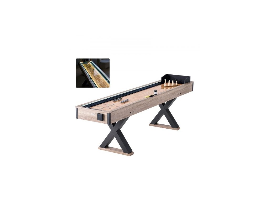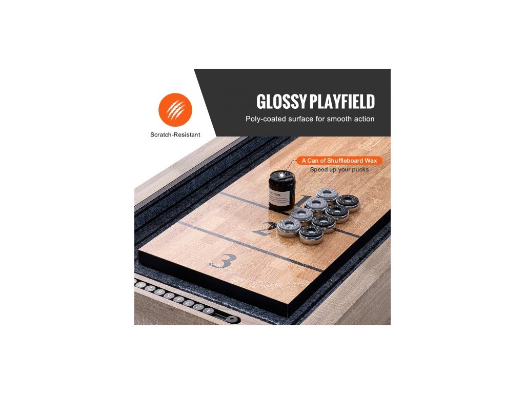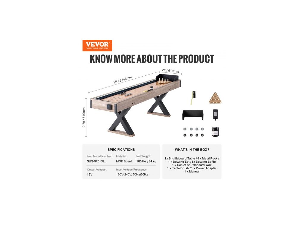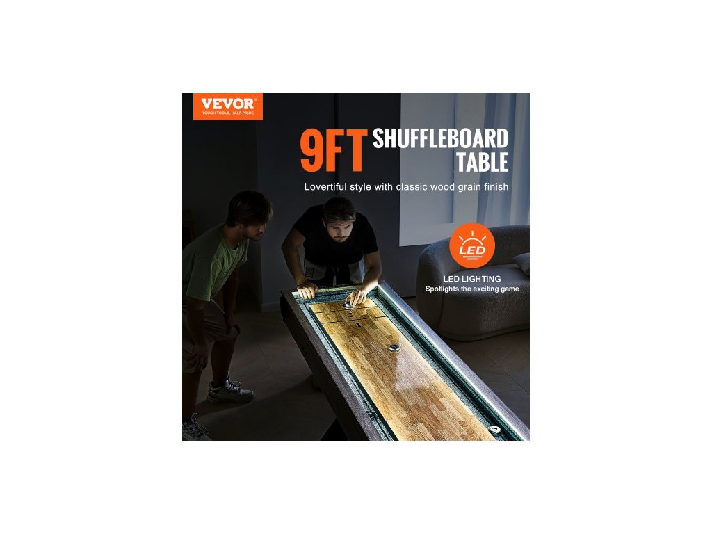 Shuffleboard stůl, 9 stop dlouhý LED shuffleboard s osvětlením pro rodinnou hernu, herní sada 2 v 1 - shuffleboard a bowling, s hrací plochou odolnou proti poškrábání, nohami, 8 puky, bowlingovou sadou, voskem, štětcemLED osvětlení