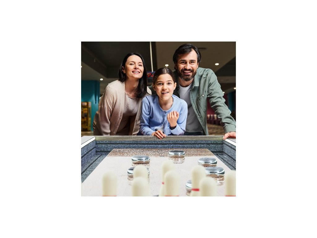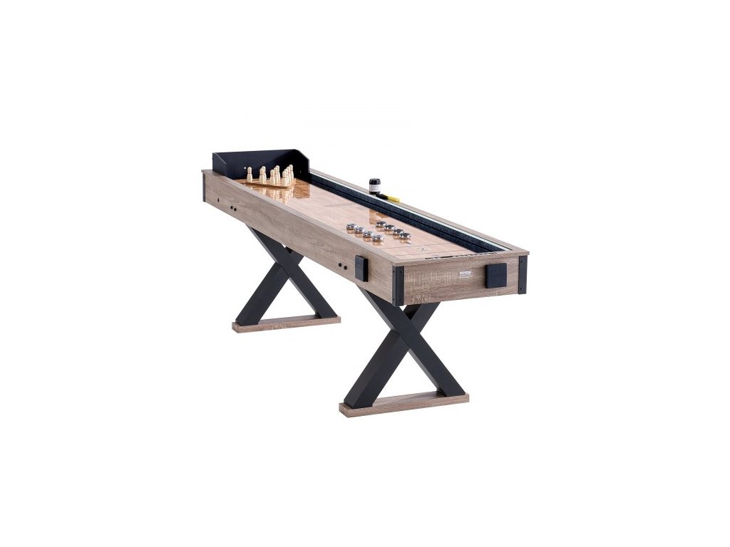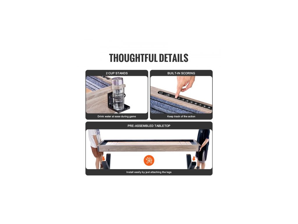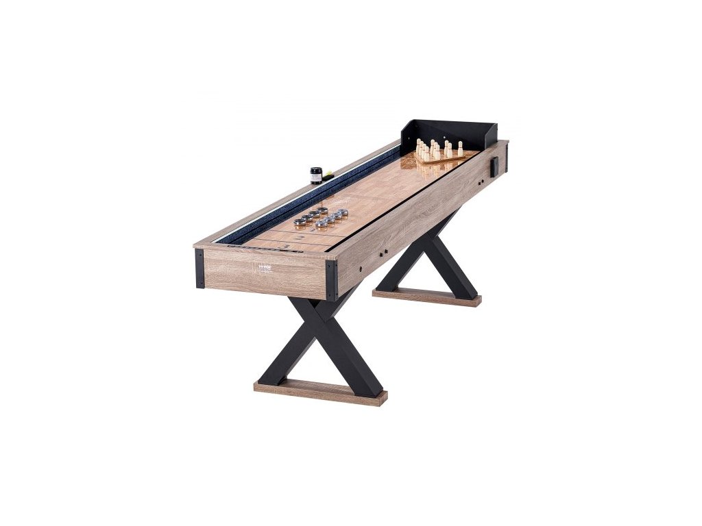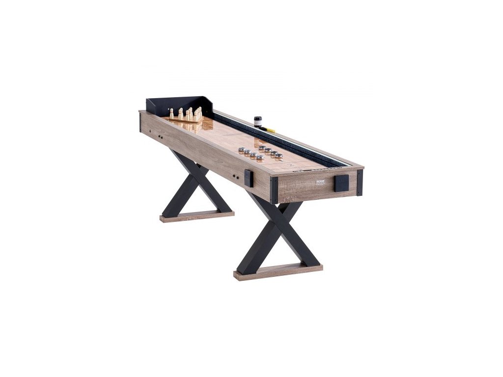 Shuffleboard stůl, 9 stop dlouhý LED shuffleboard s osvětlením pro rodinnou hernu, herní sada 2 v 1 - shuffleboard a bowling, s hrací plochou odolnou proti poškrábání, nohami, 8 puky, bowlingovou sadou, voskem, štětcemLED osvětlení