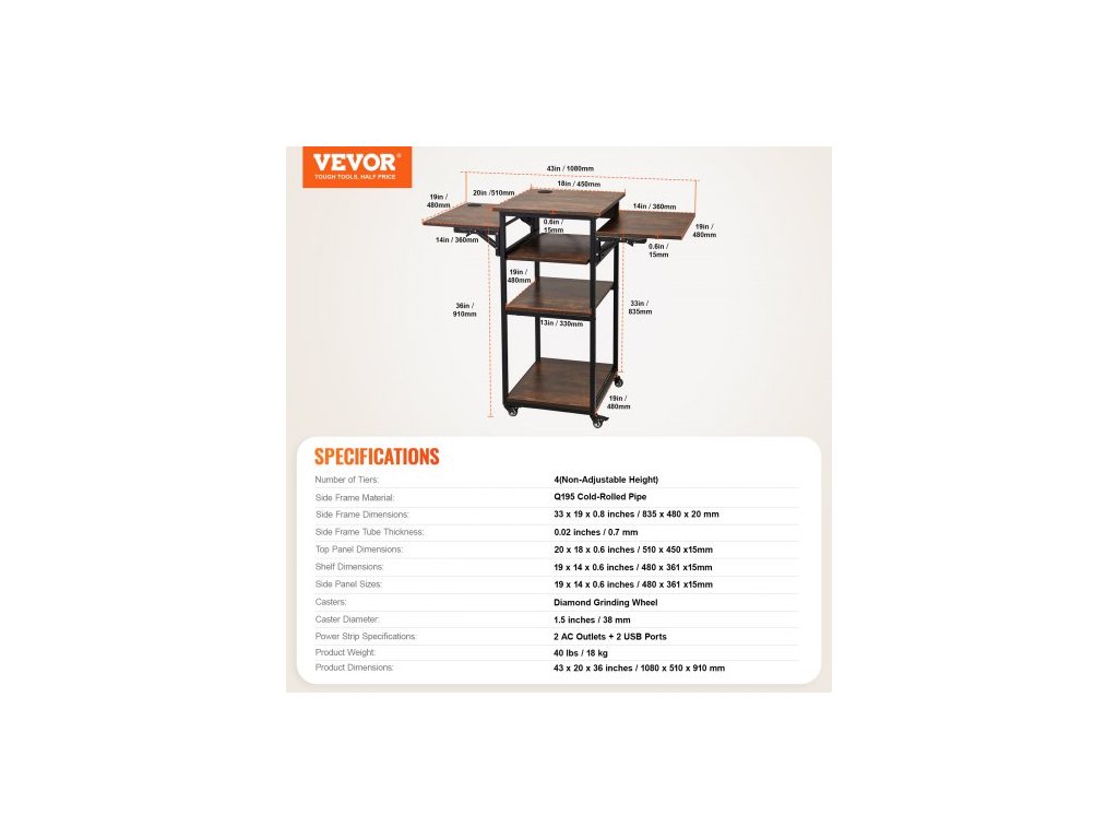 Kolečka: Diamantový brusný kotouč,Počet úrovní: 4 (nenastavitelná výška),Specifikace prodlužovacího kabelu: 2 AC zásuvky + 2 USB porty,Číslo modelu položky: C20240613W-05(US)/C20240613W-06(EU),Materiál bočního rámu: Trubka válcovaná za studena Q195,Hmotnost výrobku: 18 kg