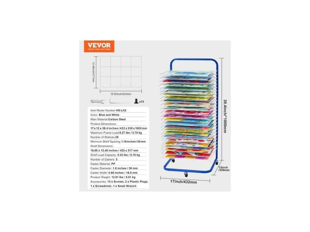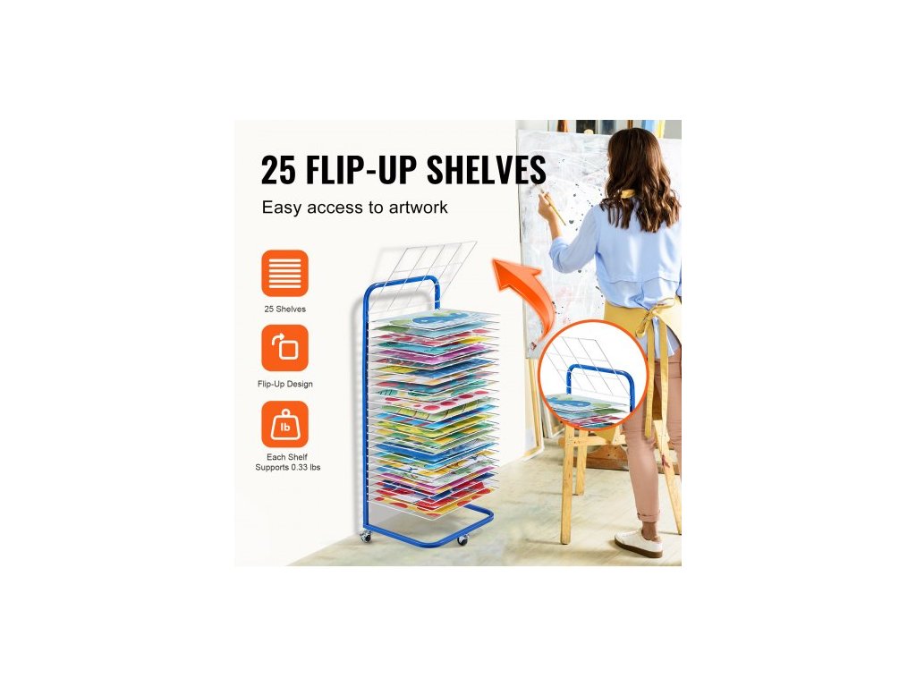 sušák na malířské předměty, 25 vyjímatelných polic, 17 x 13 x 39,4 palce, sušák na malířské předměty s uzamykatelnými kolečky, sušák na malířské předměty z uhlíkové oceli pro umělecká díla ve třídách, uměleckých ateliérech a školách, modrobílý
