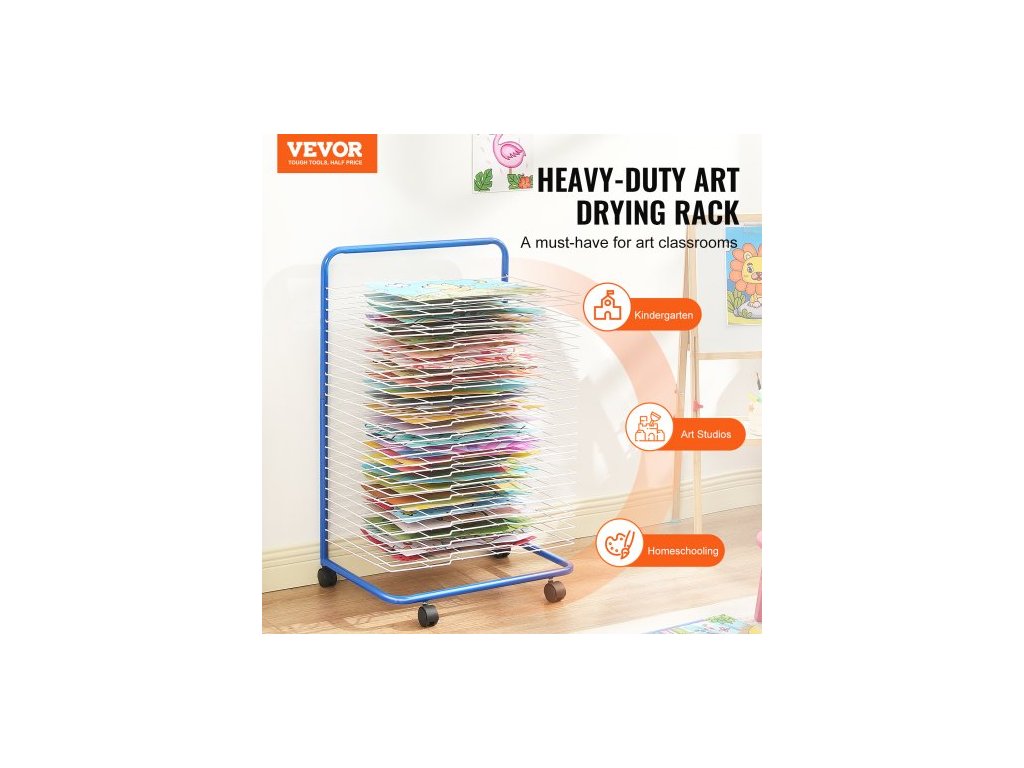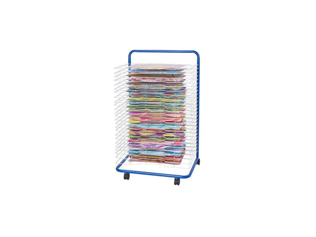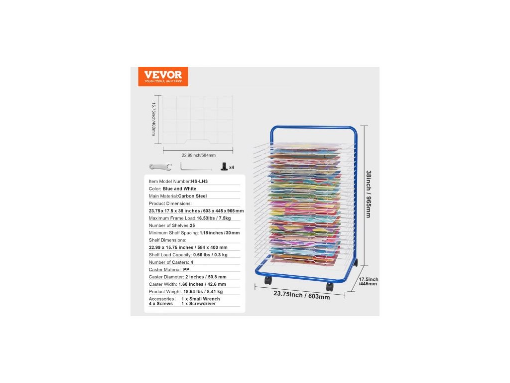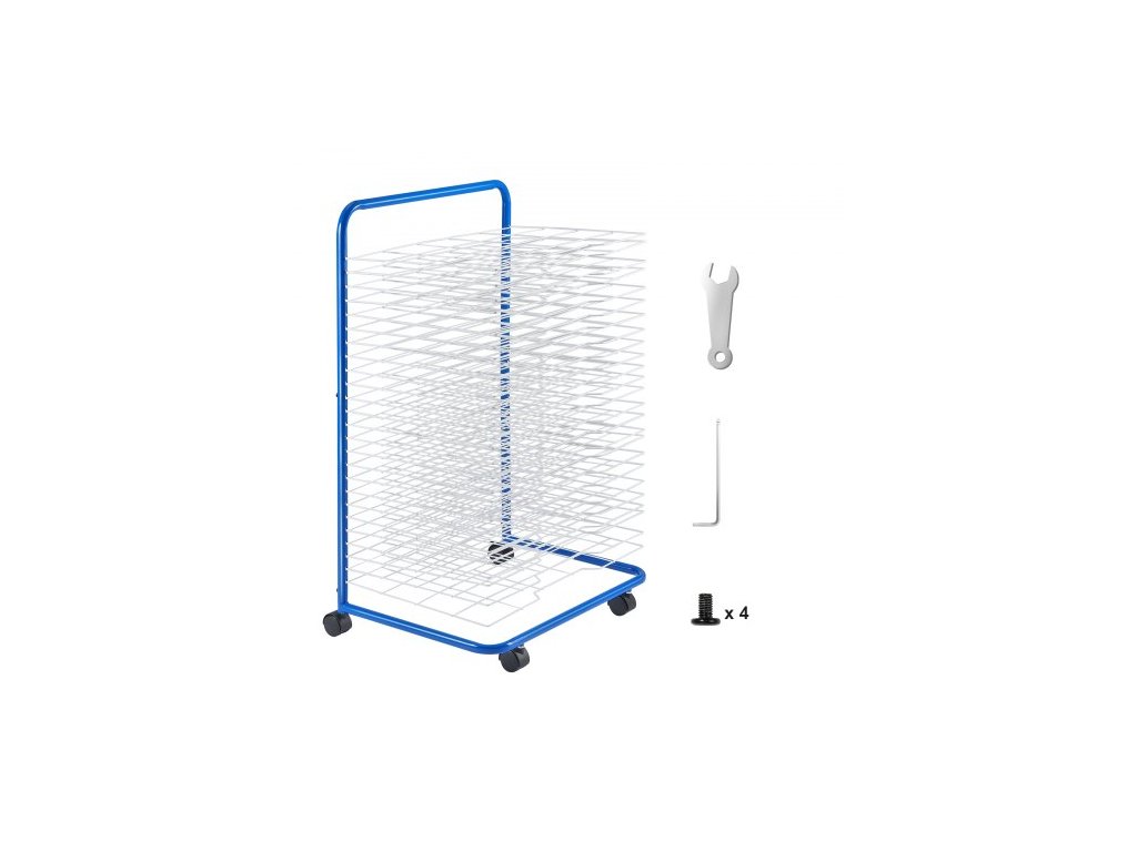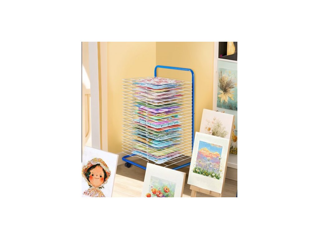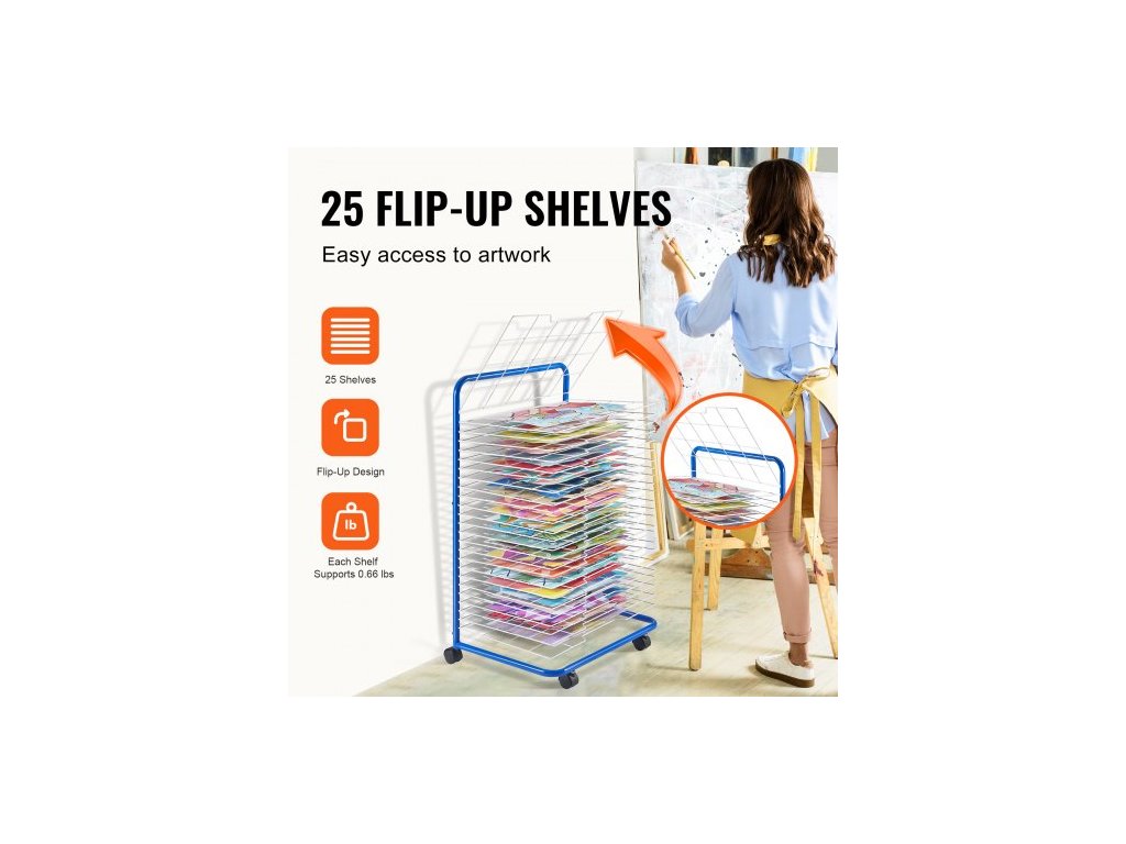 sušák na malířské předměty, 25 vyjímatelných polic, 23,75 x 17,5 x 38 palců, sušák na malířské předměty s uzamykatelnými kolečky, sušák na malířské předměty z uhlíkové oceli pro umělecká díla ve třídách, uměleckých ateliérech, školách, modrobílý