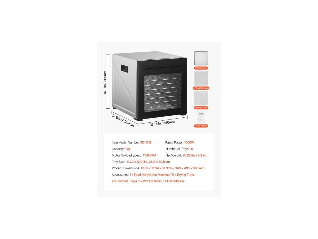 Rozměry tácu: 28,5 x 30,5 cm,Objem: 25 l,Počet táců: 10,Číslo modelu: FD-1018,Otáčky motoru naprázdno: 1150 ot./min,Jmenovitý výkon: 1000 W,Rozměry výrobku (D x Š x V): 340 x 405 x 110 cm 365 mm, Čistá hmotnost: 9,2 kg