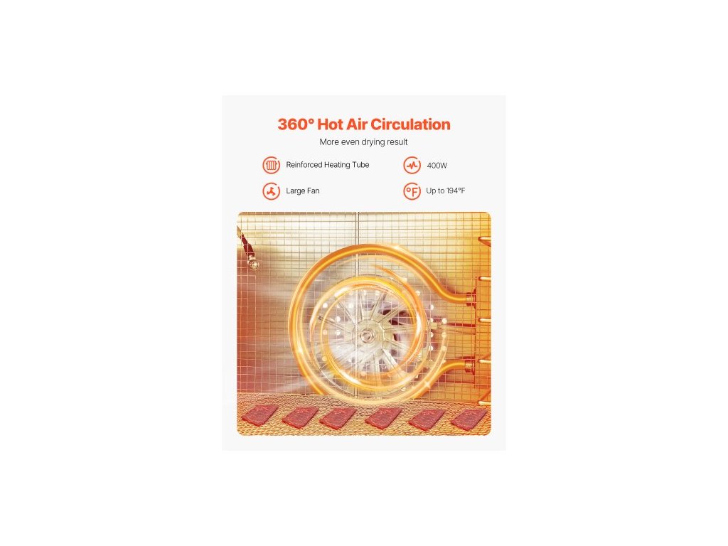 Rozměry tácu: 28 x 20 cm (tác s okrajem),Objem: 10,3 l,Počet táců: 6,Číslo modelu položky: H6-C001,Otáčky motoru naprázdno: 1320 ot./min,Jmenovitý výkon: 400 W,Rozměry výrobku (D x Š x V): 300 x 310 x 310 cm 250 mm, Čistá hmotnost: 5,5 kg