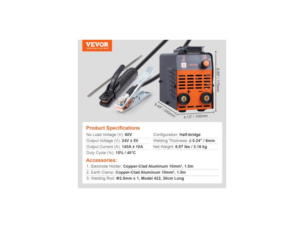 ★Výstupní proud (A): 100A ± 10A,Tloušťka svaru: ≤ 0,24" / 6 mm,★Dovolená pracovní doba (%): 15% / 40°C,★Konfigurace: Poloviční můstek,Rozměry výrobku (D x Š x V): 9,45 x 4,13 x 6,89 palců / 240 x 105 x 175 mm,Číslo modelu položky: MMA-140-NA,Jmenovitý proud (A): 140 A, Výstupní napětí (V): 24 V ± 5 V, Napětí bez zátěže (V): 58 V ± 10 V, Čistá hmotnost: 3,16 kg