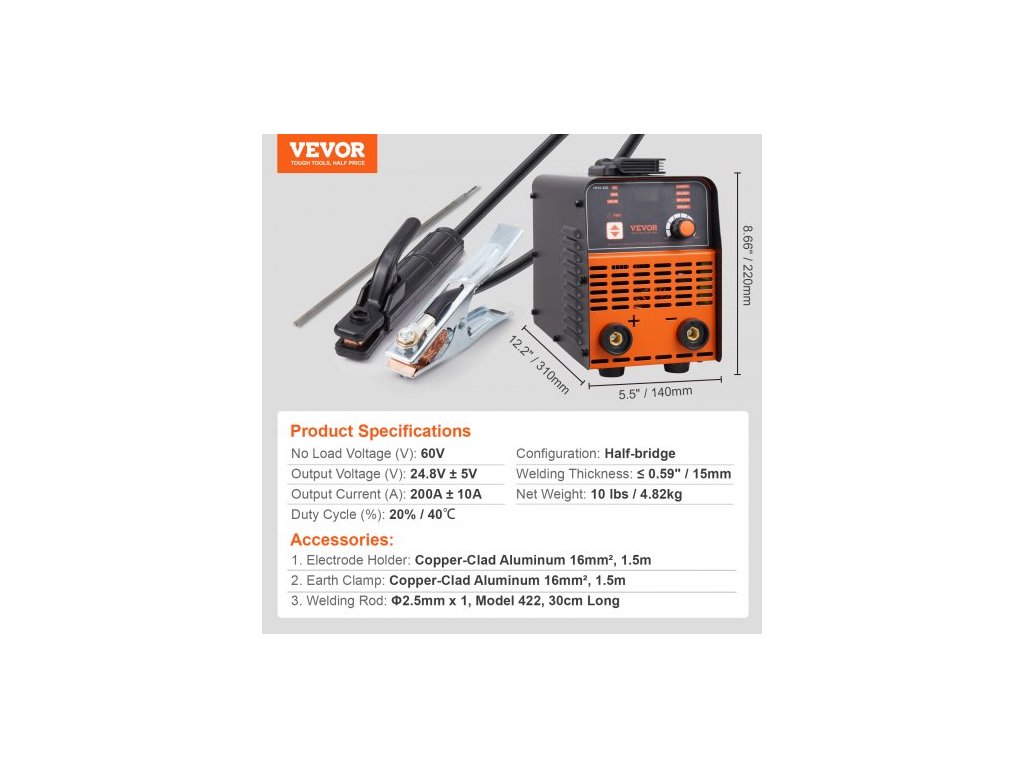 ★Výstupní proud (A): 160A ± 10A,Tloušťka svaru: ≤ 0,59" / 15 mm,★Dovolená pracovní doba (%): 20% / 40°C,★Konfigurace: Poloviční můstek,Rozměry výrobku (D x Š x V): 12,2 x 5,5 x 8,66 palce / 310 x 140 x 220 mm,Číslo modelu položky: MMA-200-NA,Jmenovitý proud (A): 200 A, Výstupní napětí (V): 26,4 V ± 5 V, Napětí bez zátěže (V): 62 V ± 10 V, Čistá hmotnost: 4,82 kg