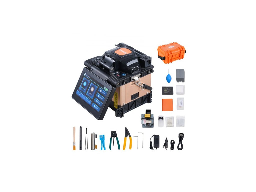Svářečka optických vláken se 4 motory, zarovnání pláště, svářečka optických vláken 6 s a ohřev 13 s, svářečka vláken s 5" dotykovou obrazovkou, držák vláken 3 v 1, baterie 7800 mAh pro SM, MM, DS, NZDS