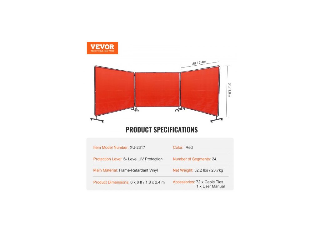 Úroveň ochrany: 6stupňová UV ochrana,Rozměry jedné zástěny: 6 x 8 stop,Počet segmentů: 24,Barva: Červená,Číslo modelu položky: XU-2317,Čistá hmotnost: 52,2 lbs / 23,7 kg,Hlavní materiál: Ohnivzdorný vinyl