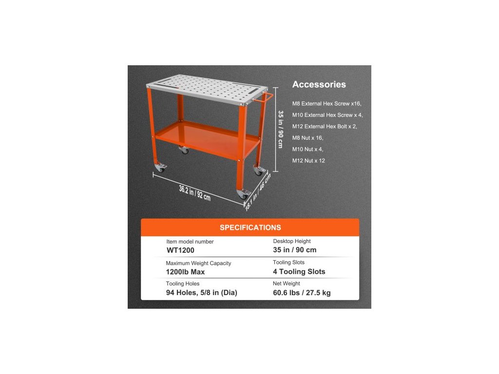 Rozměry stolu: 36 x 18 palců / 91,4 x 45,7 cm,Sloty pro nástroje: 4 sloty pro nástroje,Číslo modelu položky: WT1200,Otvory pro nástroje: 94 otvorů, 5/8 palce (průměr),Maximální nosnost: 1200 liber Max,Materiál: Uhlíková ocel,Čistá hmotnost: 60,6 liber / 27,5 kg