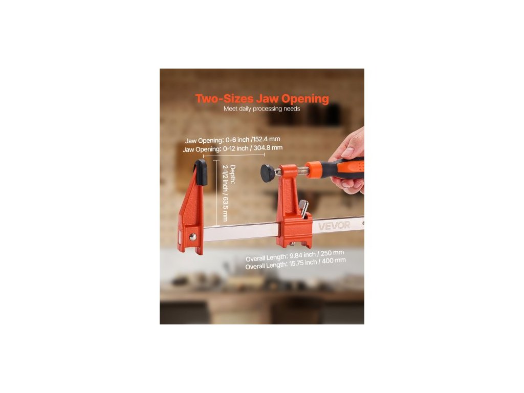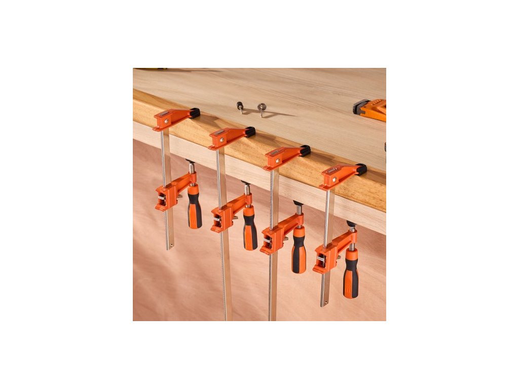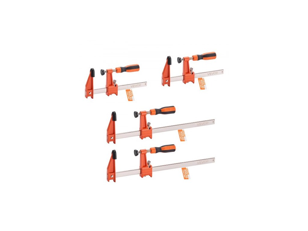 Svěrky pro dřevoobrábění, balení po 2 kusech 15,24 cm a 2 kusech 30,48 cm, uzamykatelná svěrka ve tvaru F s nosností 272 kg, hloubka 63,5 mm, litina a uhlíková ocel, svěrky na dřevo pro dřevoobrábění a kovobrábění