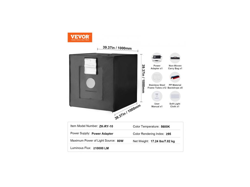 Maximální výkon světelného zdroje: 80 W,Teplota chromatičnosti: 5600 K,Index podání barev: ≥95,Číslo modelu položky: ZK-RY-10,Rozměry produktu: 39,37 x 39,37 x 39,37 palce/1000 x 1000 x 1000 mm,Čistá hmotnost: 17,24 lbs/7,82 kg,Napájení:Napájecí adaptér,Světelný tok: ≥10000 LM