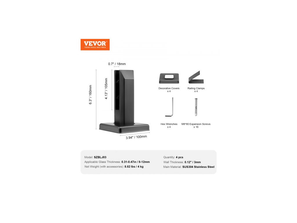 Použitelná tloušťka skla: 0,31-0,47" / 8-12 mm, Čistá hmotnost (s příslušenstvím): 8,82 lbs / 4 kg, Výška drážky: 2,17" / 55 mm, Model: SZBLJ03, Celkové rozměry (D x Š x V): 3,94x3,94x6,3" / 100x100x160 mm, Množství: 4 ks, Tloušťka stěny: 0,12" / 3 mm ±0,3, hlavní materiál: nerezová ocel SUS304