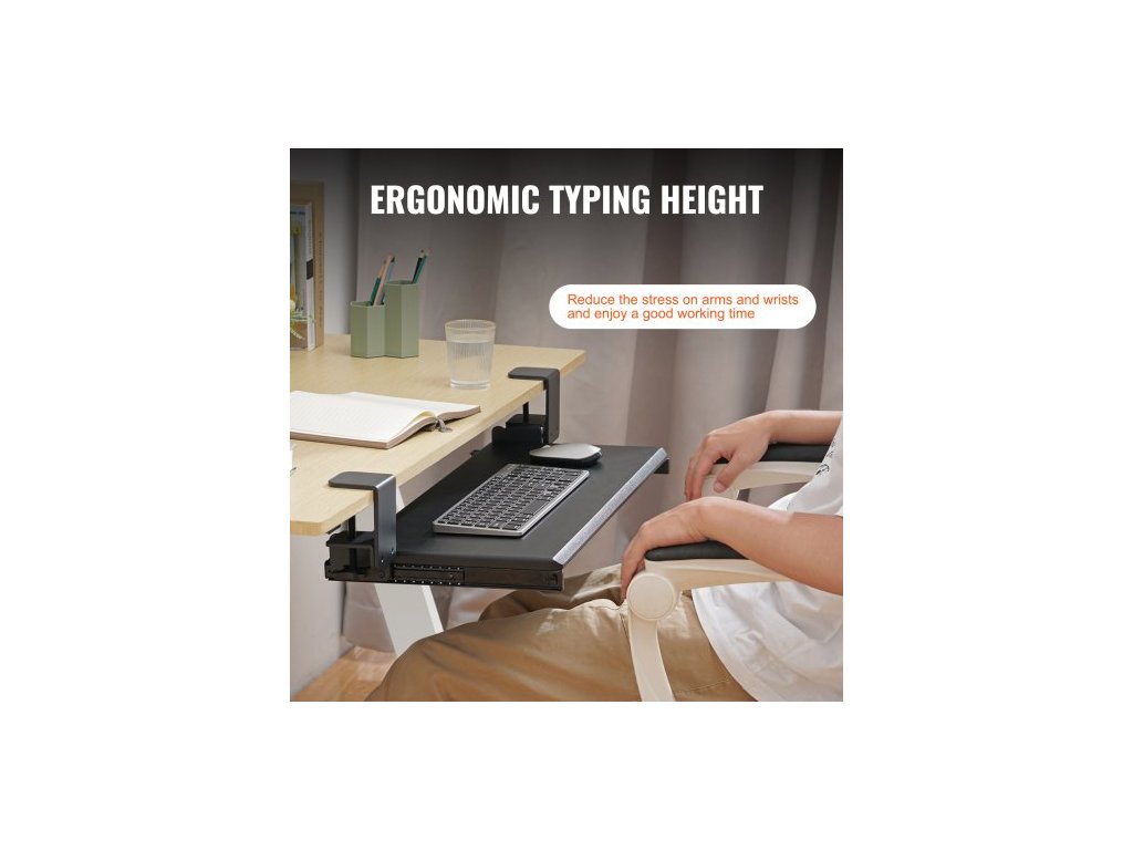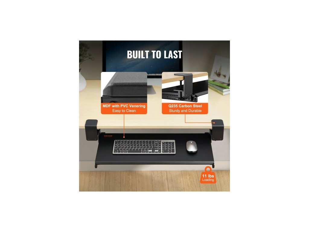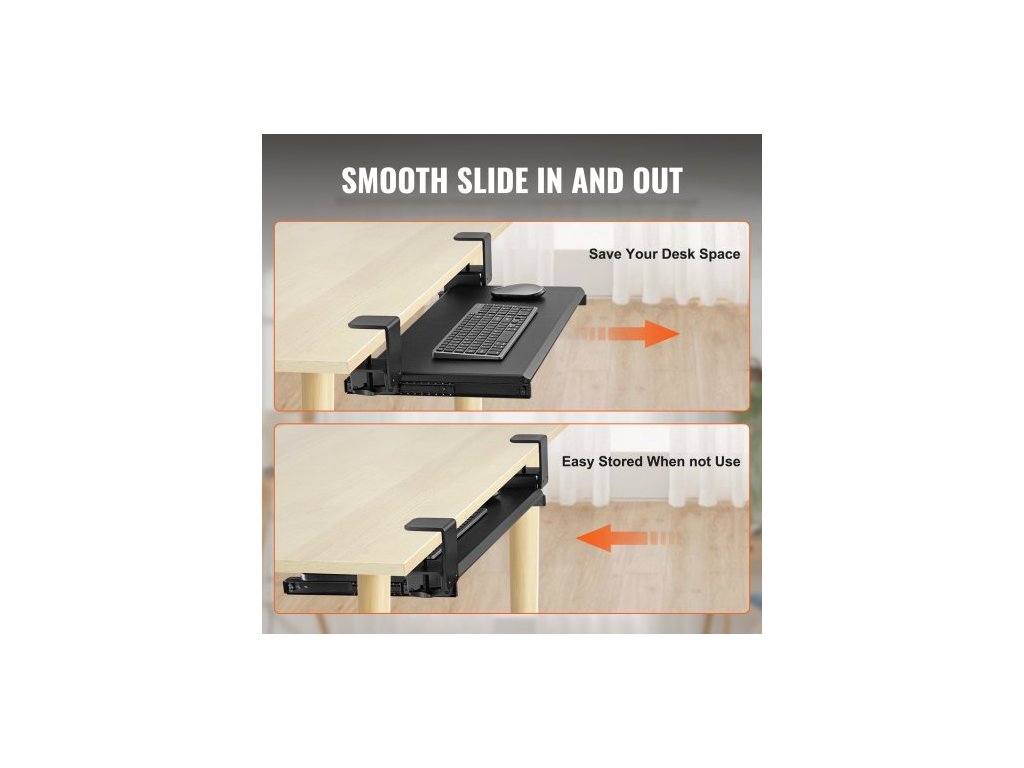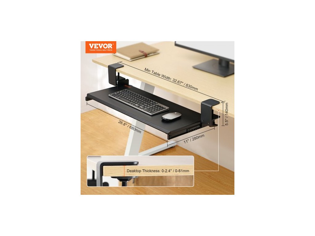 Rozměry posuvné lišty: 1,1x1,1x12,2 palce/2827310 mm,Délka posuvu: 8,7 palce/221 mm,Rozměry C-svorek: 5,5x3x3,5 palce/1407590 mm,Číslo modelu položky: VM-KB19,Nosnost: MAX 11 lbs/5 kg,Světlá výška: 3,9 palce/98 mm,Hlavní materiál: MDF deska + rám z uhlíkové oceli Q235,Hmotnost: 10,69 lbs/4,85 kg, Rozměry přihrádky na klávesnici: 12,3 x 26,8 palce/312 x 680 mm