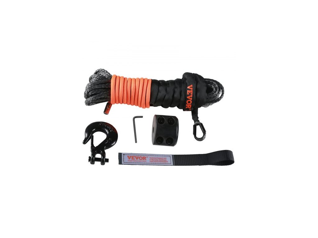Syntetické lano pro naviják , 6,35 mm x 15,24 m, 4 536 kg, syntetické lano pro naviják s ochranným pouzdrem + zarážkou + kovaným hákem pro naviják + tažným popruhem, vhodné pro čtyřkolky, UTV, malá vozidla, pickupySyntetické lano pro naviják
