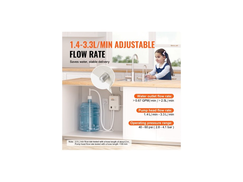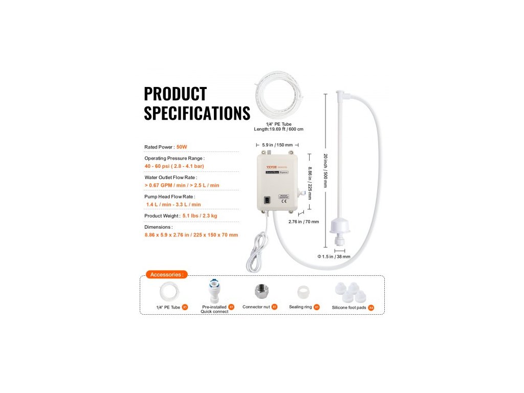 Příkon naprázdno: 15 W,Hmotnost výrobku: 5,1 lbs / 2,3 kg,Průtok vody na výstupu: >0,67 GPM/min / >2,5 l/min,Rozměry: 8,86x5,9x2,76 palce / 225x150x70 mm,Jmenovitý výkon: 50 W,Rozsah provozního tlaku: 40-60 psi (2,8-4,1 bar)