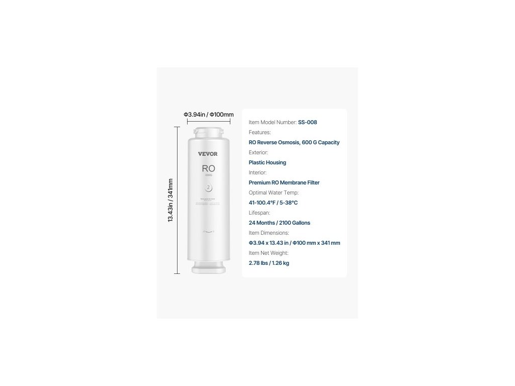 Optimální teplota vody: 5-38 °C,Číslo modelu položky: SS-008,Vlastnosti: RO reverzní osmóza,kapacita 600 g,Vnitřek: Prémiový RO membránový filtr,Rozměry položky: Φ3,94 x 13,43 palce / Φ100 x 341 mm,Čistá hmotnost položky: 2,78 lbs / 1,26 kg,Vnějšek: Plastové pouzdro,Životnost: 24 měsíců nebo 8 tun vody