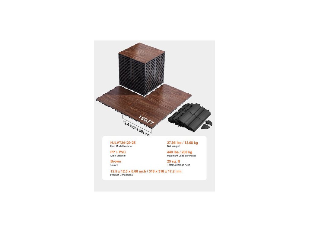 Celková plocha pokrytí: 25 čtverečních stop,Barva: Hnědá,Číslo modelu položky: HJLVT24120-25,Maximální zatížení na panel: 440 liber / 200 kg,Množství: 25 ks,Rozměry produktu: 12,4 x 12,4 x 0,68 palce / 315 x 315 x 17,2 mm,Čistá hmotnost: 27,95 liber / 12,68 kg,Hlavní materiál: PP + PVC