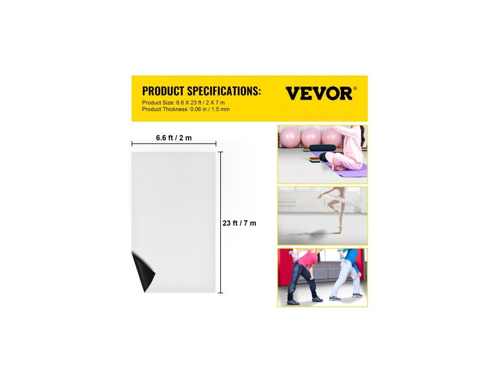 Tloušťka: 0,06 palce / 1,5 mm,Plocha krytí: 150,7 čtverečních stop / 14 m²,Barva: Bílá/Černá,Model: VV-DFM-27,Hmotnost výrobku: 64,3 liber / 29,2 kg,Materiál: PVC vinyl,Rozměry výrobku (Š x D): 6,6 stop x 23 stop / 2 m x 7 m