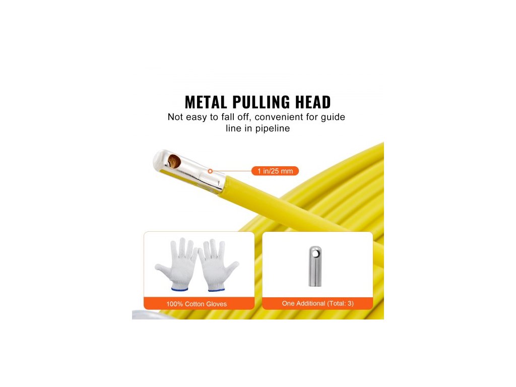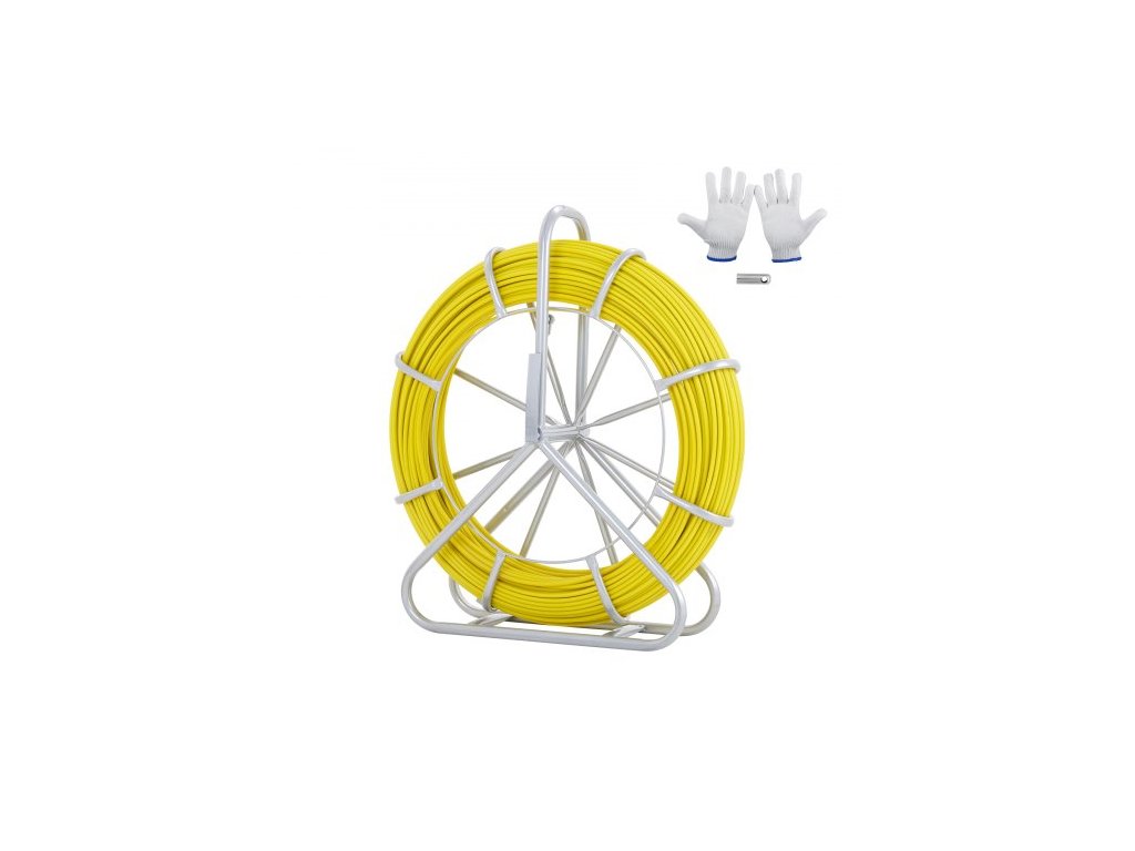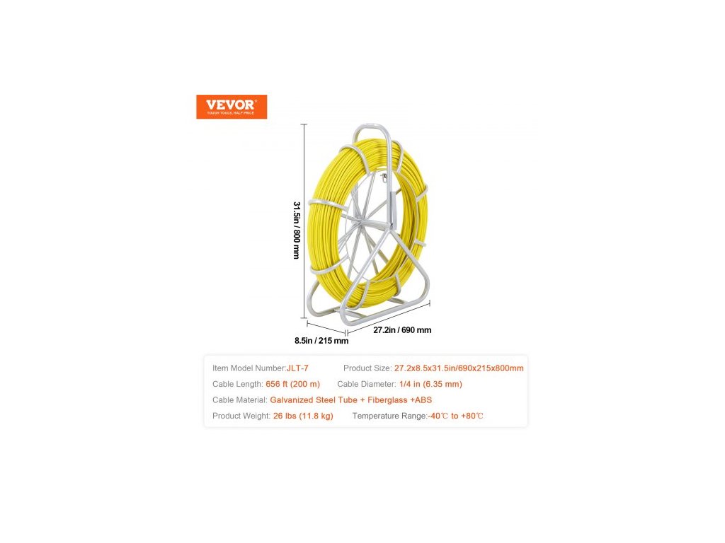 Tape Fish Tape ze skelných vláken, 200 m, 6,35 mm, stahovák drátu s tyčí na kabely, tyč na vedení kabelu s ocelovým stojanem na cívku, 3 tažné hlavy, rybářské nářadí na stěny a elektrické trubky, nevodivé