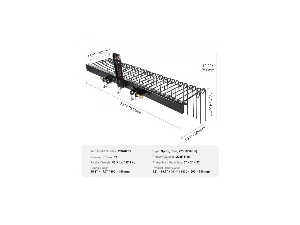 Hlavní materiál: ocel Q235, tříbodový závěs, rozměry: 3" x 2" x 3", typ: pružinové hroty, 72" (1830 mm), číslo modelu: PRAKE72, hmotnost výrobku: 83,3 lbs/37,8 kg, pružinové hroty: 15,8" x 17,7"/400 x 450 mm, počet hrotů: 32, rozměry výrobku: 72"x19,7"x31,1"/1830x500x790 mm