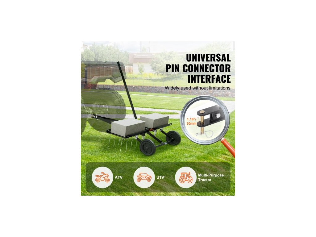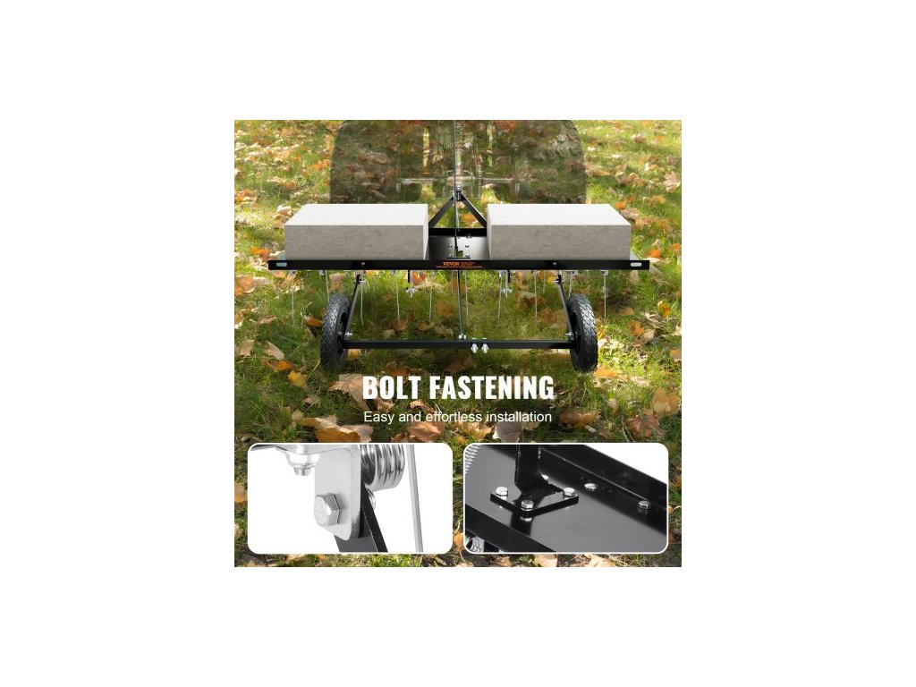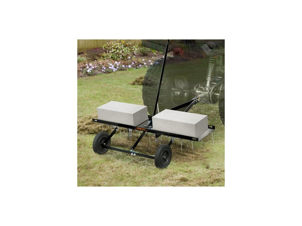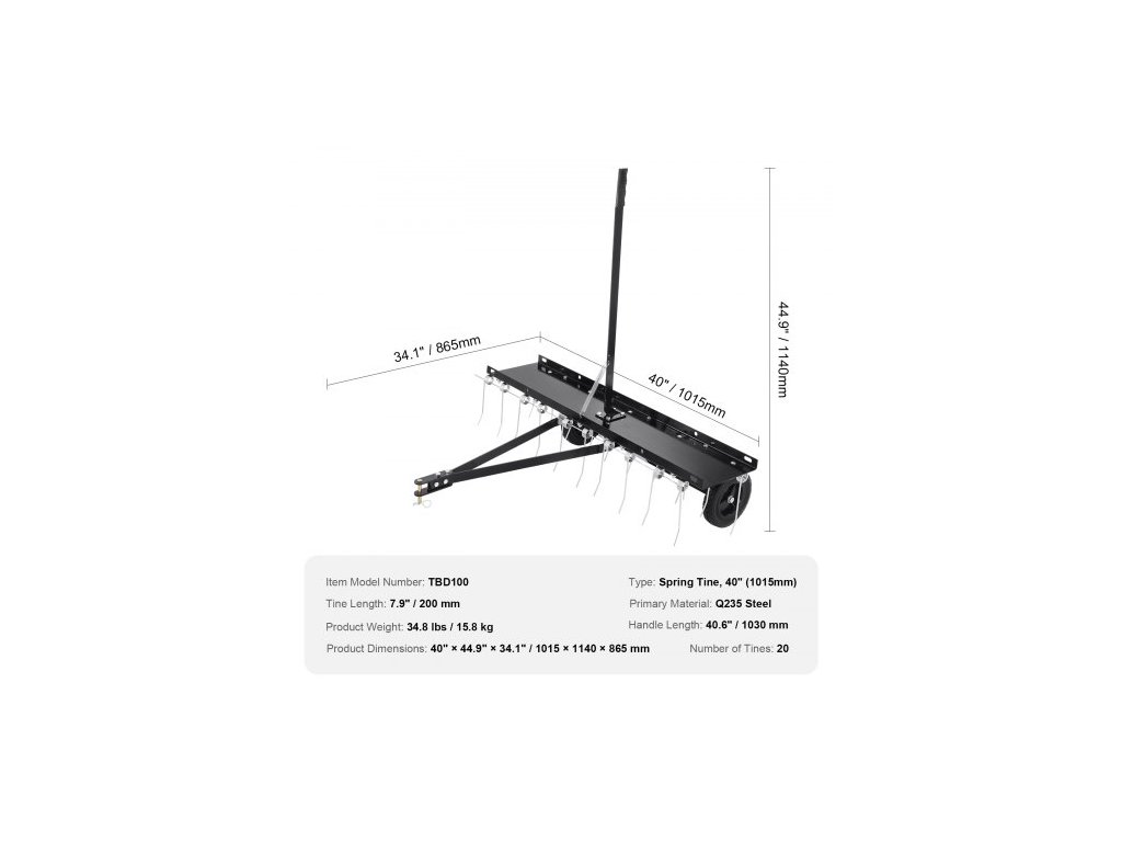 Hlavní materiál: ocel Q235, délka rukojeti: 40,6"/1030 mm, typ: pružinové hroty, 40" (1015 mm), číslo modelu položky: TBD100, hmotnost výrobku: 34,8 lbs/15,8 kg, délka hrotů: 7,9"/200 mm, počet hrotů: 20, rozměry výrobku: 40" x 44,9" x 34,1"/1015 x 1140 x 865 mm