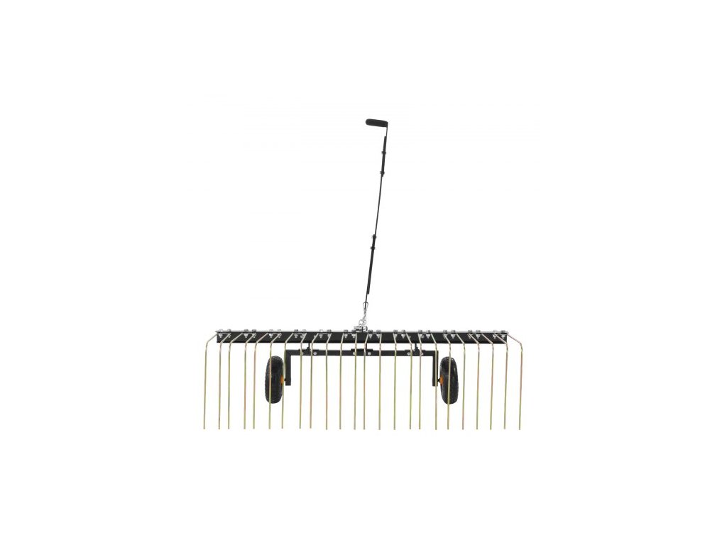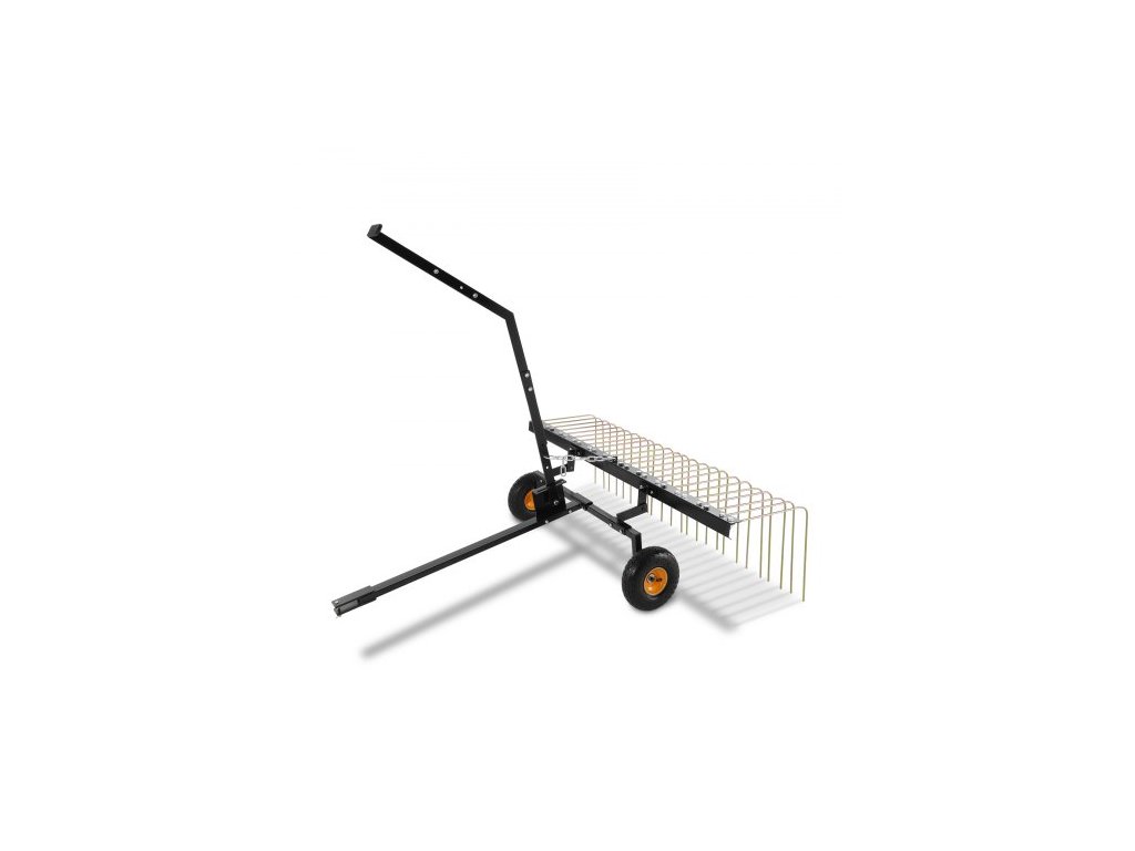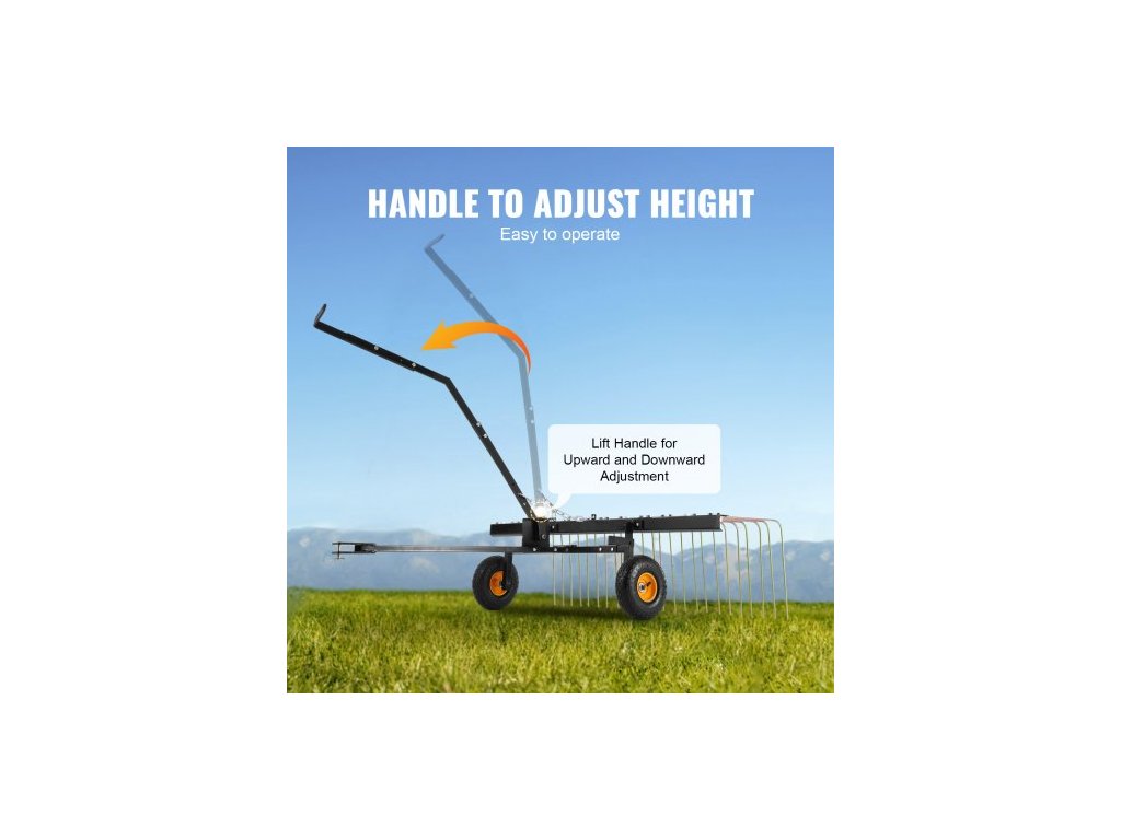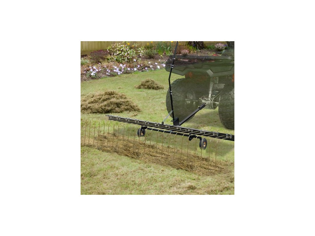 Tažný odstraňovač trávy, 60palcový tažný odstraňovač trávy s 24 ocelovými hroty, hrábě na odstraňování trávy pro čtyřkolku nebo sekačku, tažné hrábě na trávu se zvedací rukojetí na listí, jehličí a trávu