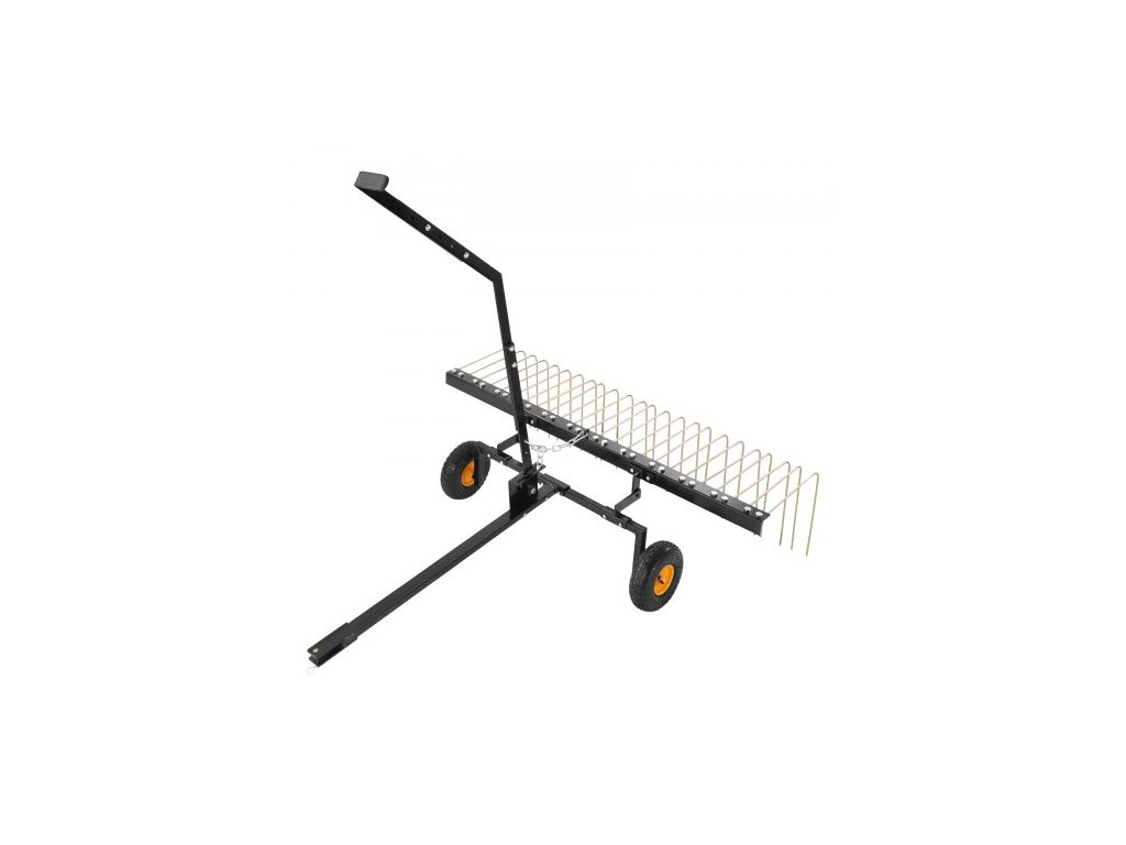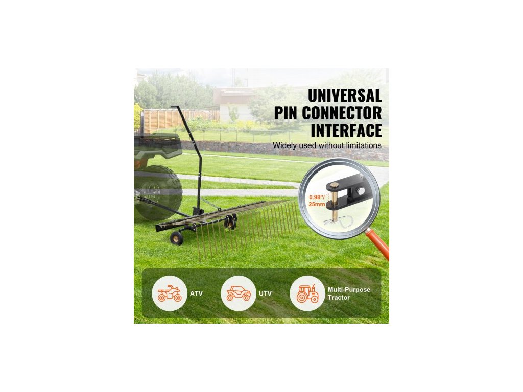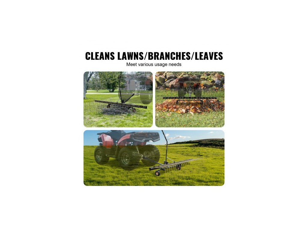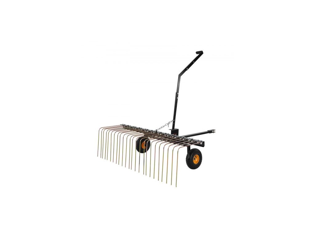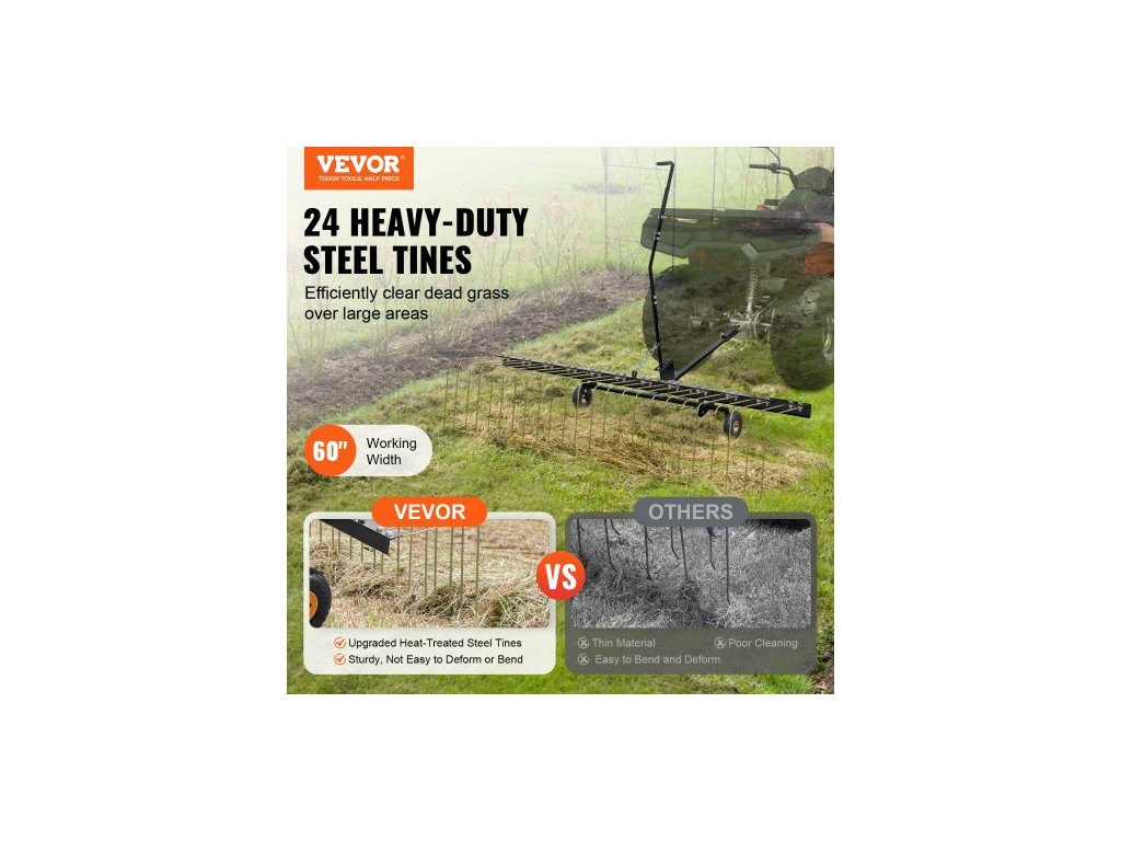 Tažný odstraňovač trávy, 60palcový tažný odstraňovač trávy s 24 ocelovými hroty, hrábě na odstraňovač trávy pro čtyřkolku nebo sekačku, tažné hrábě na trávu se zvedací rukojetí na listí, jehličí a trávuOdolná konstrukce