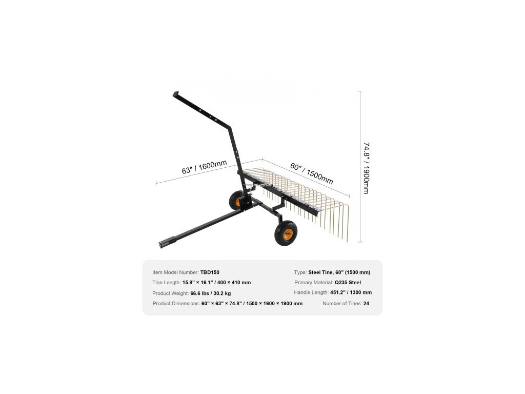 Hlavní materiál: ocel Q235, délka rukojeti: 51,2"/1300 mm, typ: ocelové hroty, 60" (1500 mm), číslo modelu položky: TBD150, hmotnost výrobku: 66,6 lbs/30,2 kg, délka hrotů: 15,8"x16,1"/400x410 mm, počet hrotů: 24, výrobek Rozměry: 1500 x 1600 x 1900 mm