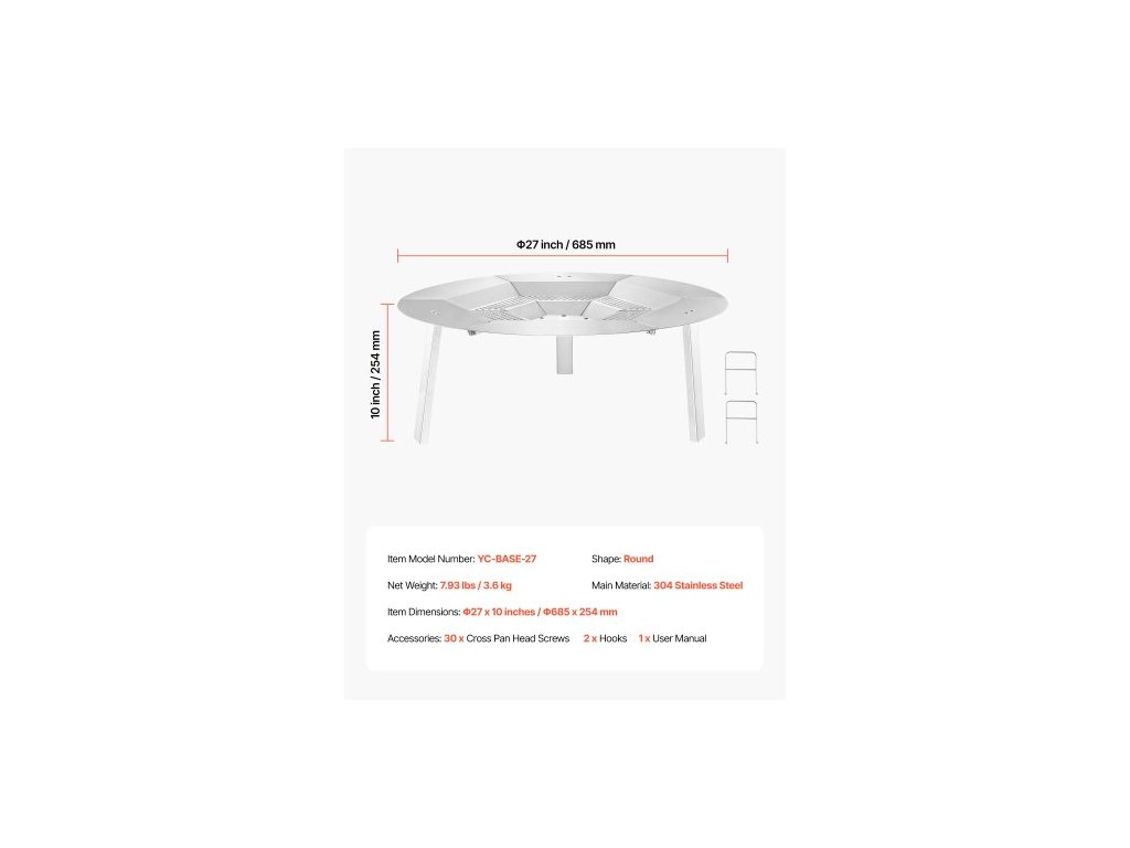 Tvar: Kulatý,Číslo modelu položky: YC-BASE-27,Rozměry položky: φ27 x 10 palců / φ685 x 254 mm,Čistá hmotnost: 7,93 lbs / 3,6 kg,Hlavní materiál: nerezová ocel 304