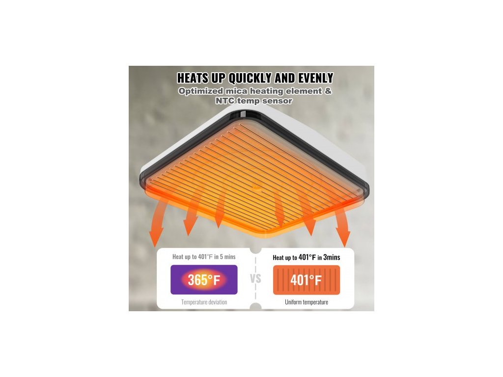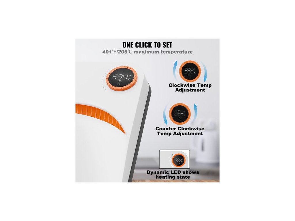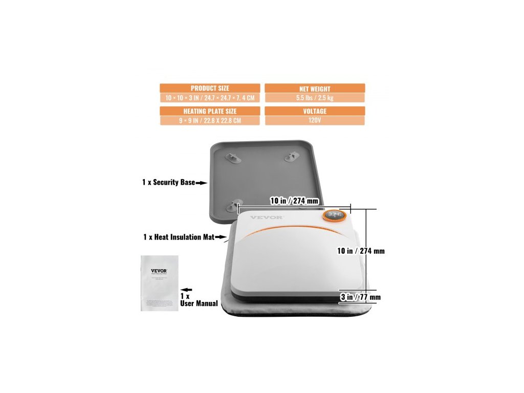 Rozměry topné desky: 9 × 9 palců / 22,8 × 22,8 cm,Časový rozsah: 1–999 s,Napětí: 220 V,Čistá hmotnost: 5,5 lbs / 2,5 kg,Příkon: 670 W,Teplotní rozsah: 40–205 ℃ / 104–401 ℉,Rozměry produktu: 10 × 10 × 3 palce / 24,7 × 24,7 × 7,4 cm