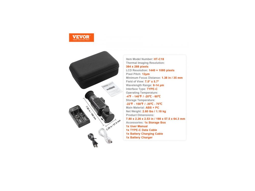 Termokamera , monokulární lovecký zobrazovací dalekohled, 1x -8x zoom, 0,39" OLED displej, přesné přiblížení, zachycení okamžiku, jasný obraz OLED, dlouhotrvající výkon, detailní kontrola, robustní a připravený k použití, provozní teplota: -4℉ - 140℉ / -20℃ - 60℃, rozlišení LCD: 1440 × 1080 pixelů, rozlišení termovize: 384 x 288 pixelů, rozměry produktu: 7,80 x 2,26 x 2,53 palce / 198 x 57,5 x 64,3 mm, rozteč pixelů: 12 μm, číslo modelu: HT-C18, zaostřovací vzdálenost: 1,38 palce / 35 mm, zorné pole: 7,5° x 5,7°,Typ rozhraní: TYPE-C,Čistá hmotnost: 1,18 kg,Rozsah vlnových délek: 8–14 μm,Hlavní materiál: ABS + PC,Skladovací teplota: -22℉ – 158℉ / -30℃ – 70℃Doplňkové parametry