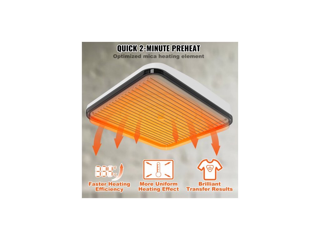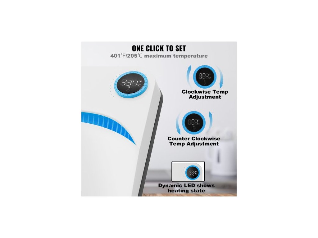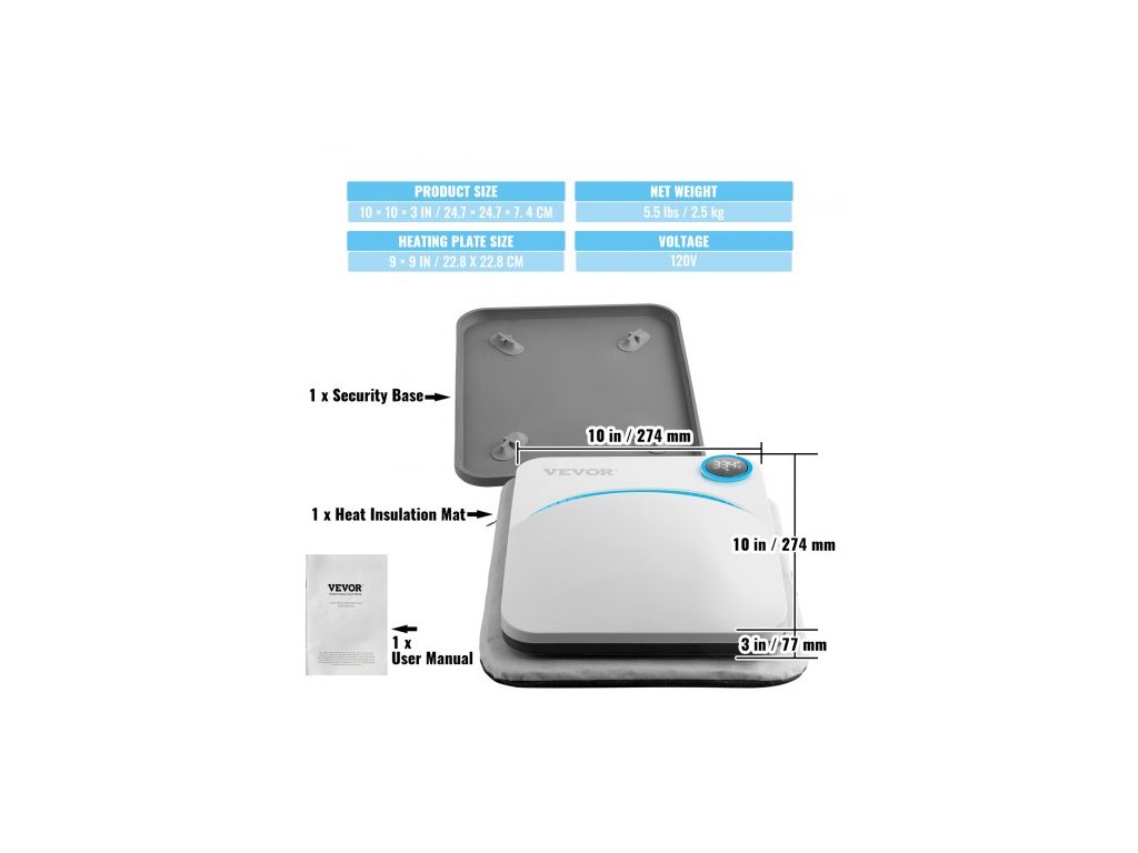 Rozměry topné desky: 9 × 9 palců / 22,8 x 22,8 cm,Časový rozsah: 1-999 s,Čistá hmotnost: 5,5 lbs / 2,5 kg,Příkon: 670 W,Teplotní rozsah: 40-205 ℃ / 104-401 ℉,Rozměry produktu: 10 × 10 × 3 palce / 24,7 × 24,7 × 7,4 cm