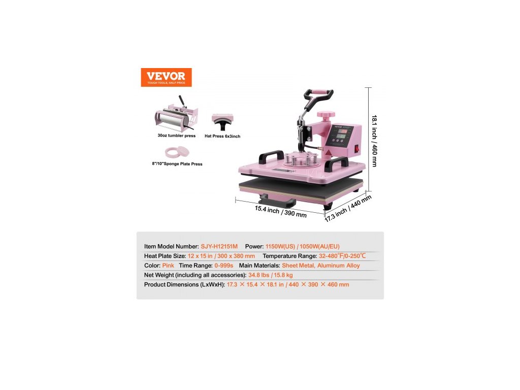 Rozměry topné desky: 12 x 15 palců / 300 x 380 mm,Hlavní materiály: Plech, hliníková slitina,Čistá hmotnost (včetně veškerého příslušenství): 34,8 lbs / 15,8 kg,Časový rozsah: 0-999 s,Barva: Růžová,Číslo modelu položky: SJY-H12151M,Teplotní rozsah: 32-480℉/0-250℃,Příkon: 1150 W (USA) / 1050 W (AU/EU)