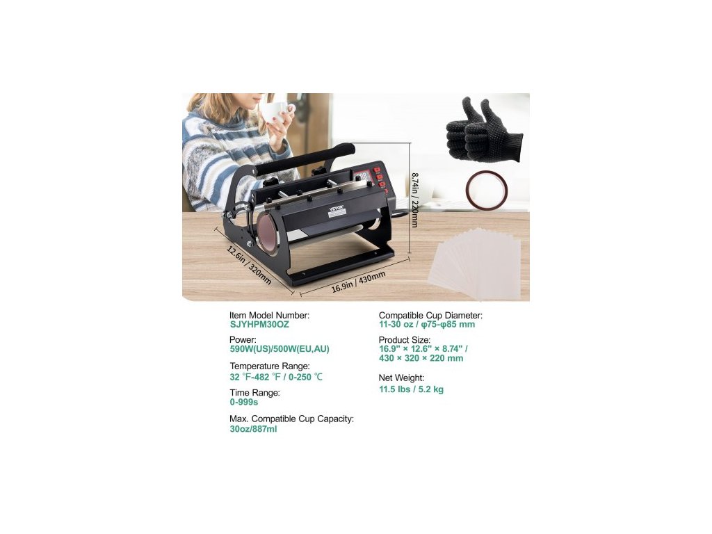 Čistá hmotnost (včetně příslušenství): 11,5 lbs / 5,2 kg, Časový rozsah: 0-999 s, Max. Kompatibilní objem hrnku: 30 oz / 887 ml, Maximální výška hrnku: 9,8" / 250 mm, Číslo modelu položky: SJYHPM30OZ, Teplotní rozsah: 32 ℉-482 ℉ / 0-250 ℃, Příkon: 590 W (USA) / 500 W (EU, AU), Hlavní materiál: Plech
