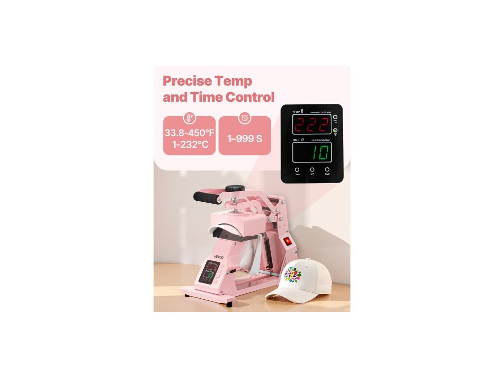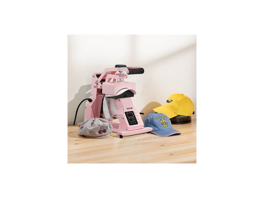 Termolis na čepice , se 2 vyměnitelnými deskami, přesné ovládání teploty a času, lis na čepice pro nažehlovací a sublimační projekty HTV, na čepice, čelenky, manžety, roušky, růžová