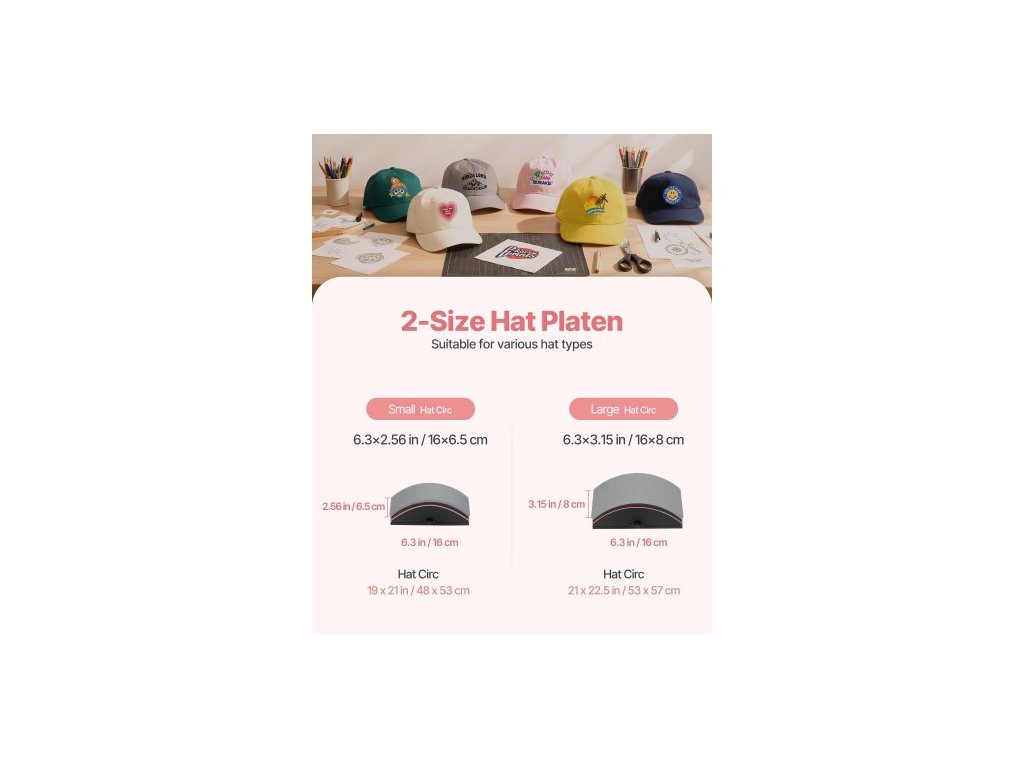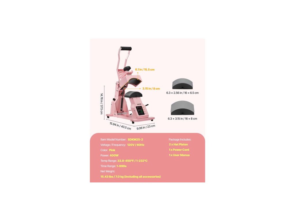 Rozměry desky na klobouky 1: 6,3 x 2,56 palce / 160 x 65 mm,Nastavitelný rozsah časovače: 1-999 s,Čistá hmotnost (včetně veškerého příslušenství): 15,43 lbs / 7,0 kg,Rozměry topné desky: 6,1 x 3,15 palce / 155 x 80 mm,Maximální tlak termolisu: >220 lbs / 100 kg,Barva: Růžová,Číslo modelu položky: SDKM25-2,Teplota Rozsah: 33,8–450 ℉ / 1–232 ℃, Rozměry desky Hat Platen 2: 6,3 x 3,15 palce / 160 x 80 mm, Rozměry výrobku (D x Š x V): 15,94 x 9,06 x 14,76 palce / 405 x 230 x 375 mm, Příkon: 400 W