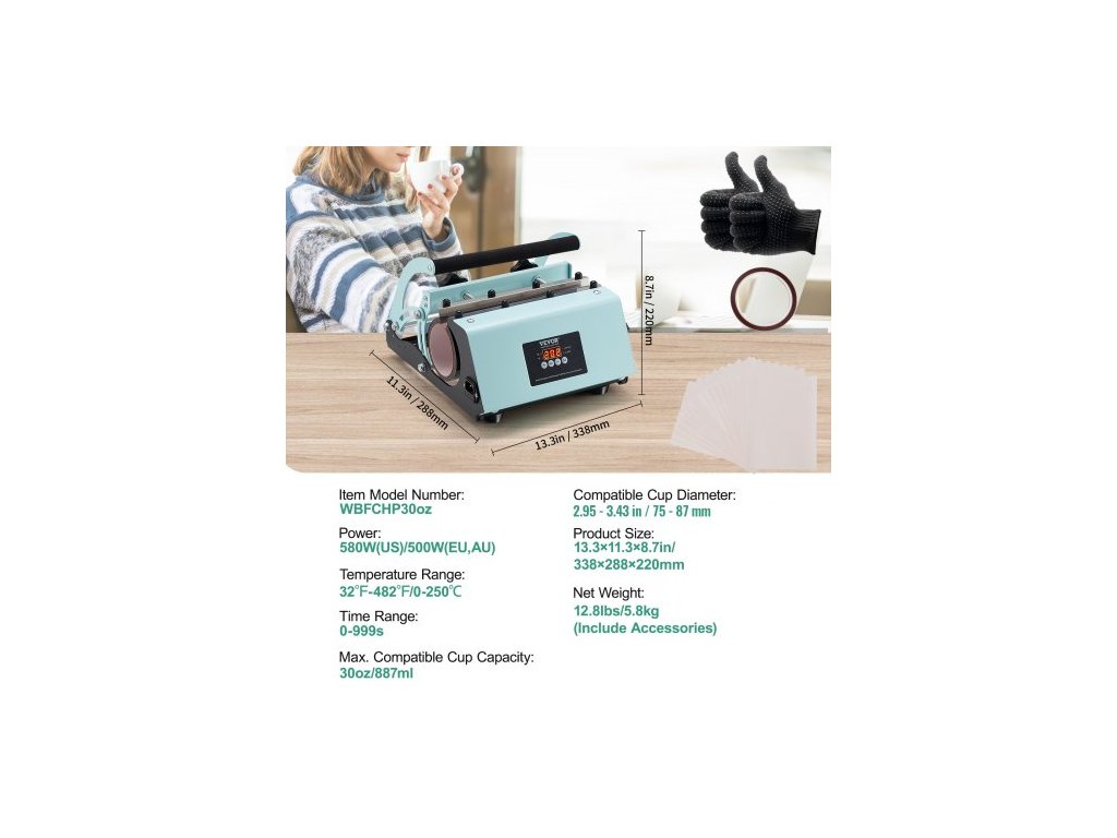 Čistá hmotnost (včetně příslušenství): 5,8 kg, Časový rozsah: 0–999 s, Max. kompatibilní objem hrnku: 887 ml, Max. výška hrnku: 250 mm, Číslo modelu: WBFCHP30OZ, Teplotní rozsah: 0–250 °C, Příkon: 580 W (USA) / 500 W (EU, AU), Hlavní materiál: Uhlíková ocel, nerezová ocel