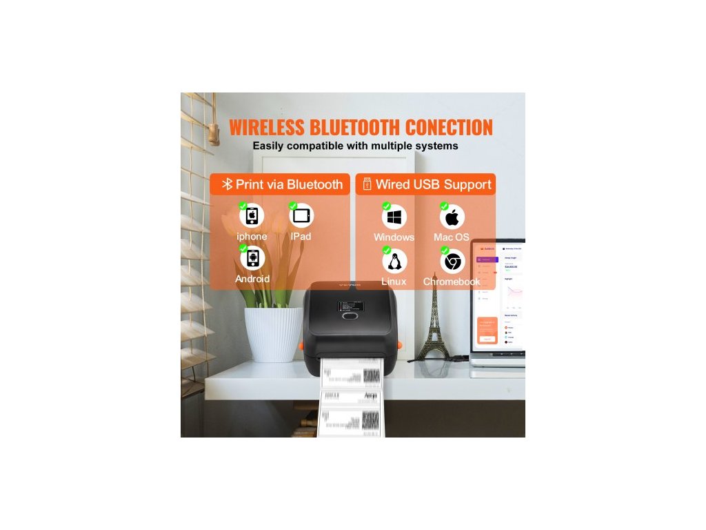 Termotiskárna štítků , 300 DPI pro poštovní balíky 4x6, bezdrátové připojení Bluetooth a automatické rozpoznávání štítků, podpora Windows/MacOS/Linux/Android/IOS, kompatibilní s Amazon, eBay, Etsy atd.Pohodlná technologie Bluetooth
