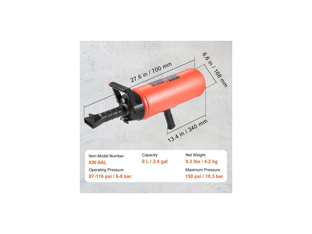 Provozní tlak: 87-116 psi/6-8 barů,Objem: 9 l/2,4 gal,Číslo modelu položky:XW-9AL,Čistá hmotnost:9,3 lbs/4,2 kg,Maximální tlak: 150 psi/10,3 barů,Rozměry výrobku:27,6 x 6,6 x 13,4 palce/700 x 168 x 340 mm