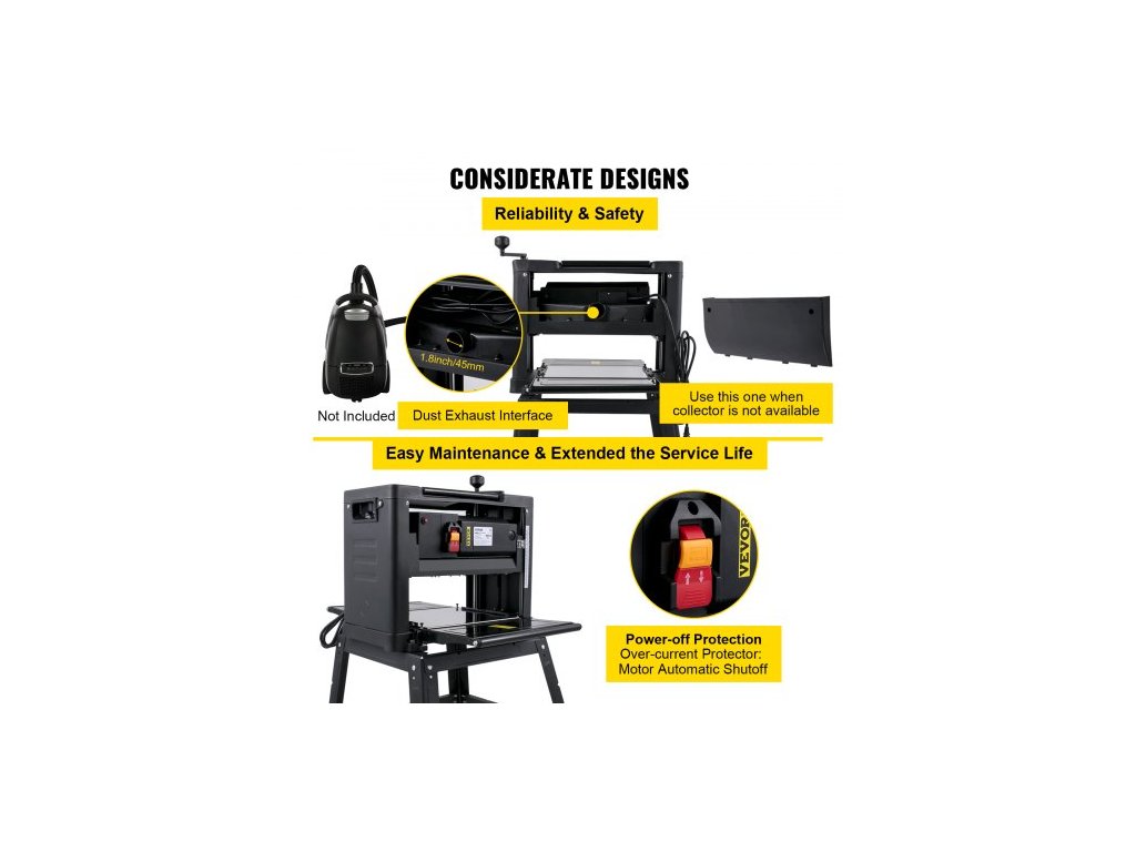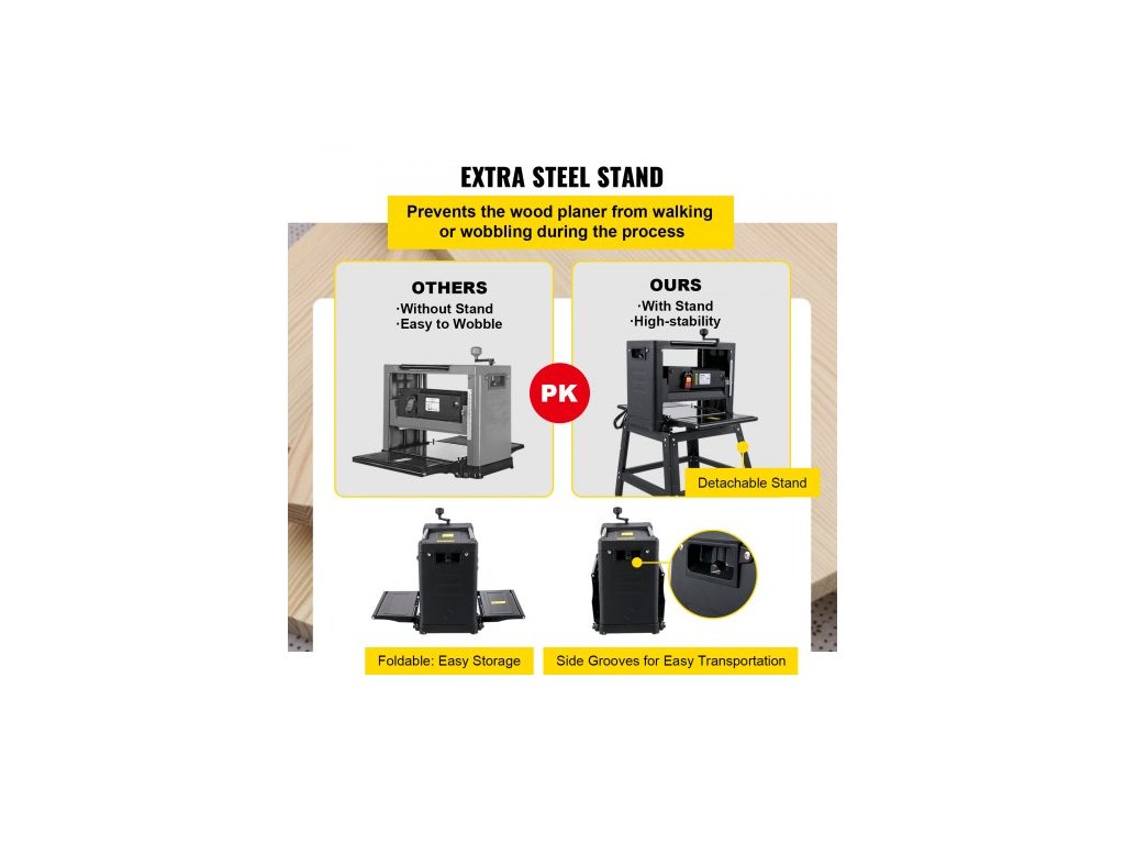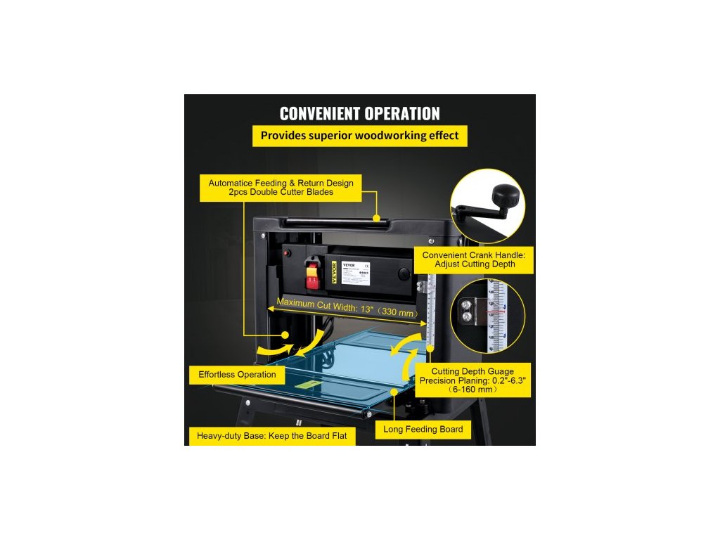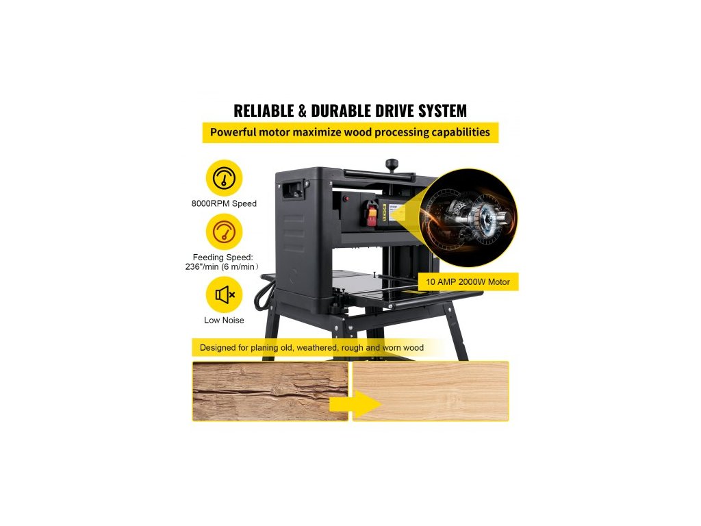 Srovnávač tloušťky 330 mm (13 palců) stolní srovnávač 2000W srovnávač dřeva 8000 ot./min srovnávač dřeva 10 A skládací srovnávač dřeva rychlost hoblování 6 m/min s železným stojanem odsávání prachu pro zpracování dřevěných prkenVýkonný motor 2000 W
