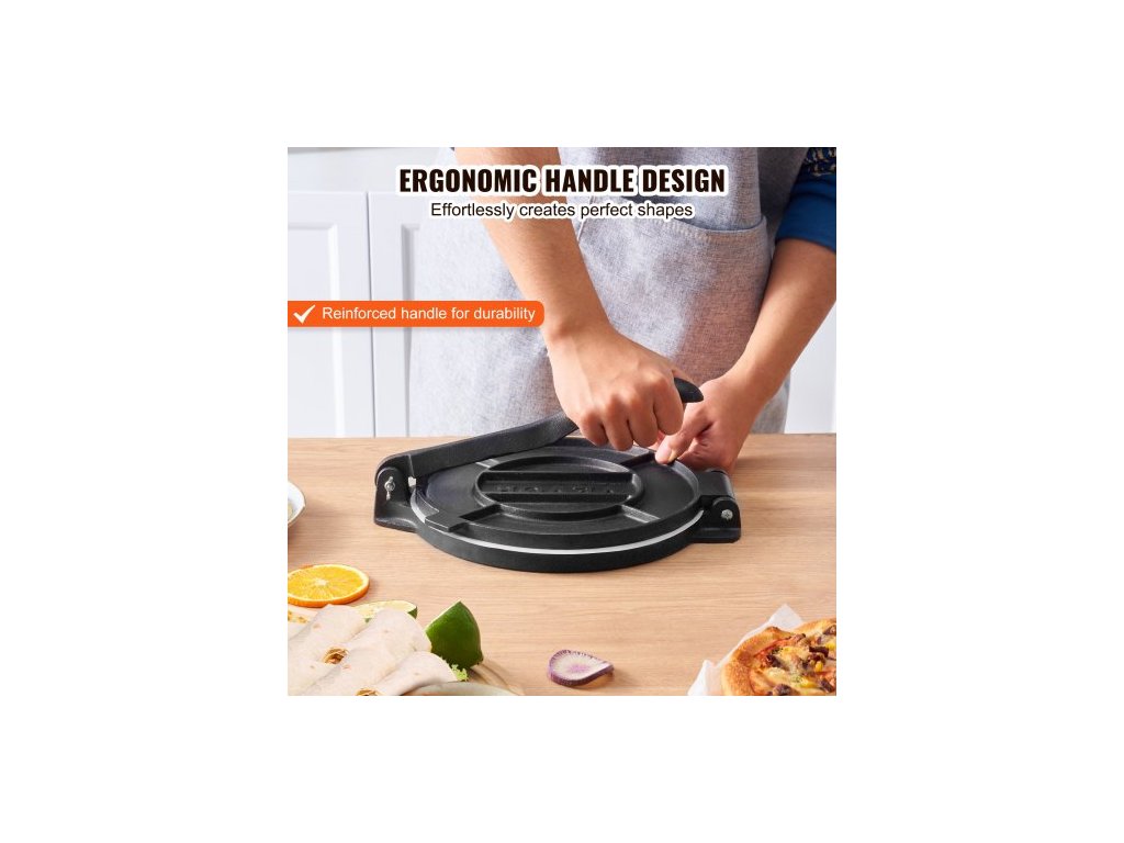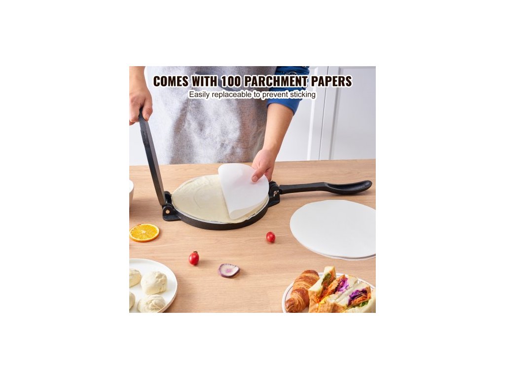Lis na tortilly , lis na tortilly a roti 10 palců, litinový lis na tortilladora pro vysoké zatížení, lis na předem ochucené pataconery se 100 kusy pergamenového papíru, lis na těsto na moučné tortilly, tawa, stříbroMultifunkční